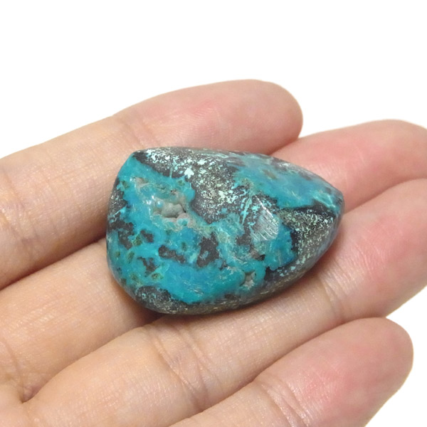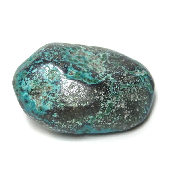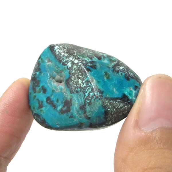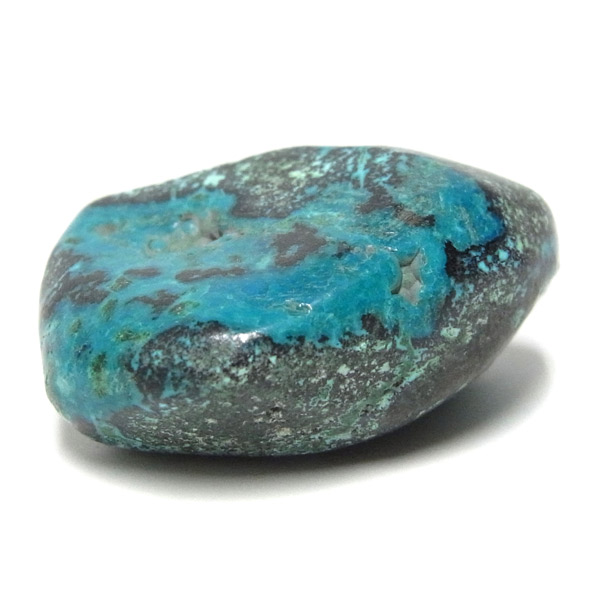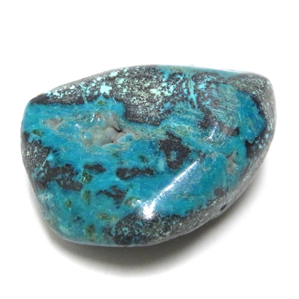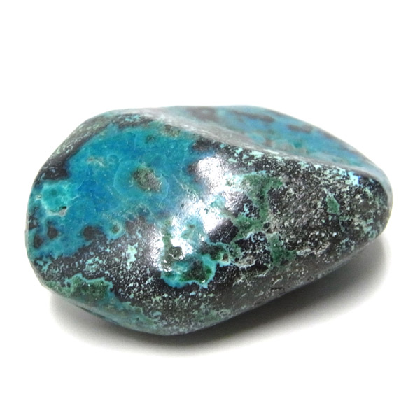 コンゴ産のシャッタカイトのタンブルです。 コンゴ産のシャッタカイトは、まだまだ新しい これから注目される鉱物です。シャッタカイトは銅のケイ酸塩の水酸化物の鉱物で、1915年に最初に発見されたアメリカのアリゾナ州のシャッタク鉱山が名前の由来です。 そこではマラカイトも産出されましたが、マラカイトの結晶を保ったまま成分が入れ替わる、仮晶という現象が起き、それがシャッタカイトとして発見されました。シャッタカイトは鮮やかなブルーグリーンが特徴の鉱物です。