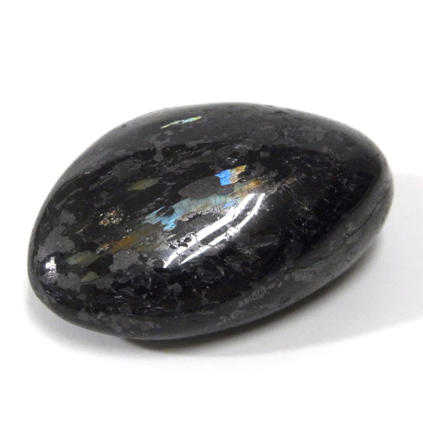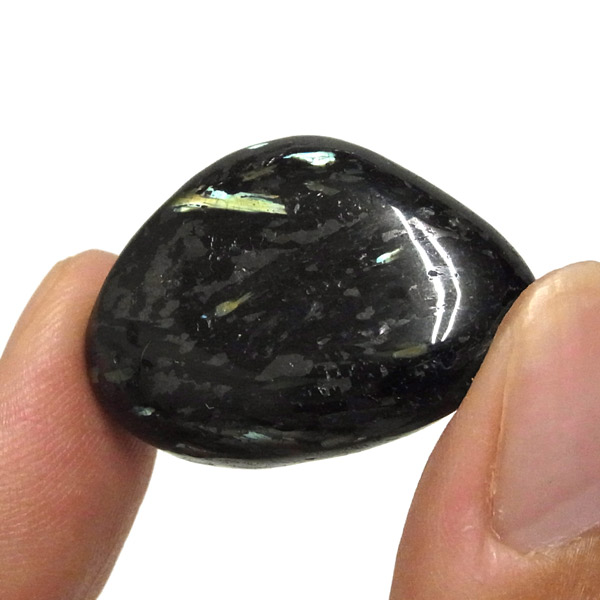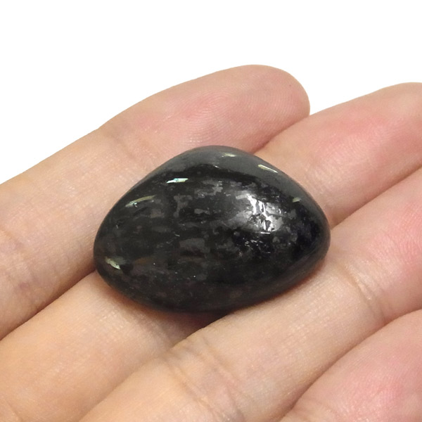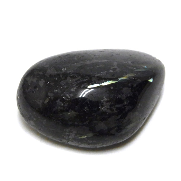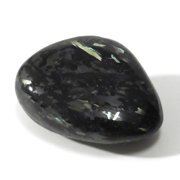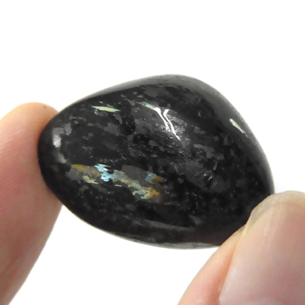 グリーンランド産の高品質ヌーマイト、タンブルです。 ヌーマイトは、1982年にグリーンランドのヌーク地方で発見され、地名に因んで名づけられました。ヌーマイト自体は30億年前から地球に存在したといわれる石で、気の遠くなるような年月を経て現代に現れた石だといわれています。和名は角閃石片麻岩。アンソフィライトやゲドライト、石英、など多様なミネラルを含んでいるといわれています。一見、真っ黒い石に見えますが、光の角度によって鮮やかなゴールド、グリーン、ブルーなどのさまざまな色の閃光を示します。グリーンランド産のヌーマイトの虹色は、極微視的なアンソフィライトとゲドライトの交互の溶出ラメラ構造から反射された光の干渉によるものということです。世界で最も美しいと知られるのがグリーンランドのヌーマイトといわれています。