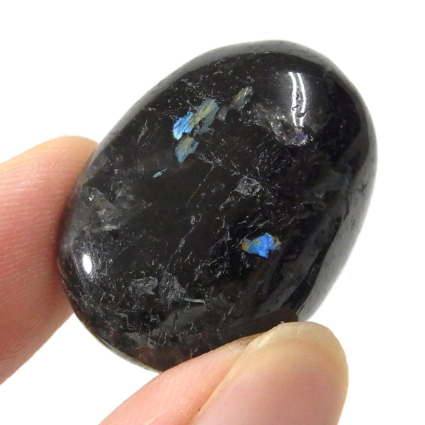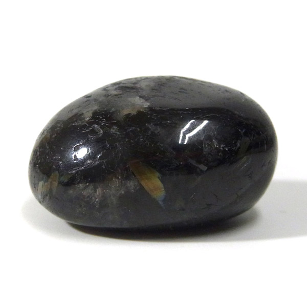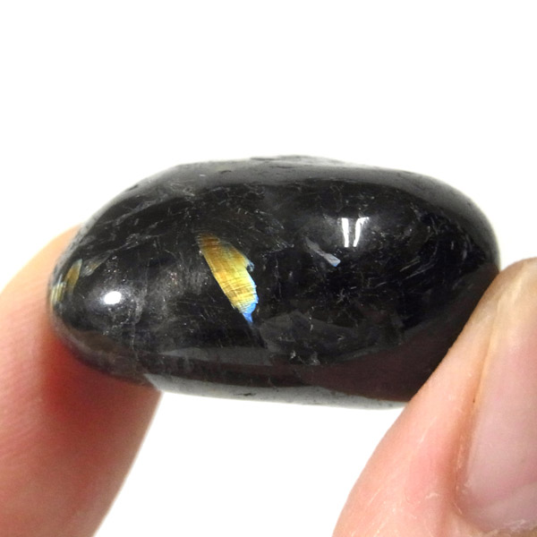 グリーンランド産の高品質ヌーマイト、タンブルです。 ヌーマイトは、1982年にグリーンランドのヌーク地方で発見され、地名に因んで名づけられました。ヌーマイト自体は30億年前から地球に存在したといわれる石で、気の遠くなるような年月を経て現代に現れた石だといわれています。和名は角閃石片麻岩。アンソフィライトやゲドライト、石英、など多様なミネラルを含んでいるといわれています。一見、真っ黒い石に見えますが、光の角度によって鮮やかなゴールド、グリーン、ブルーなどのさまざまな色の閃光を示します。グリーンランド産のヌーマイトの虹色は、極微視的なアンソフィライトとゲドライトの交互の溶出ラメラ構造から反射された光の干渉によるものということです。世界で最も美しいと知られるのがグリーンランドのヌーマイトといわれています。