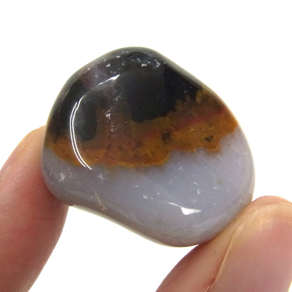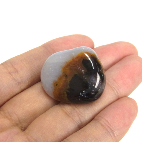 インド産のスレイマンアゲート、タンブルです。 スレイマンアゲートは白黒模様が特徴で縞メノウ(天眼石)の仲間です。 独特で縞メノウと結晶化した二酸化ケイ素含む水溶液が周期的に沈殿し、そのたびごとに不純物が取り込まれ、層状に結晶化したものです。白い部分が多いスレイマンアゲートはより稀少になります。
