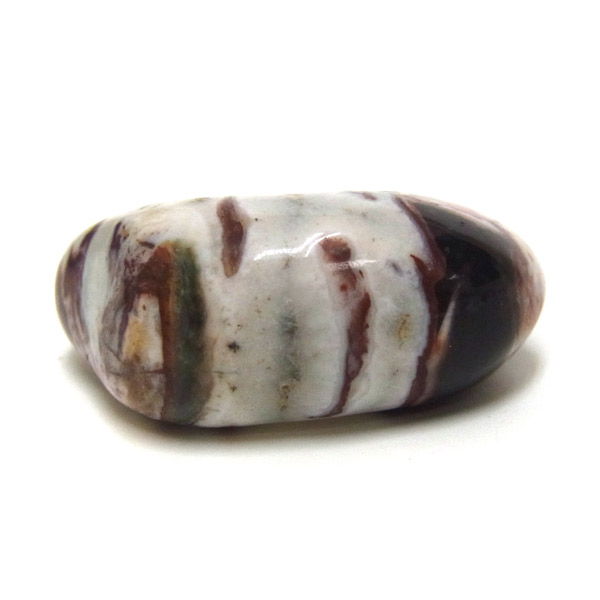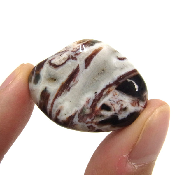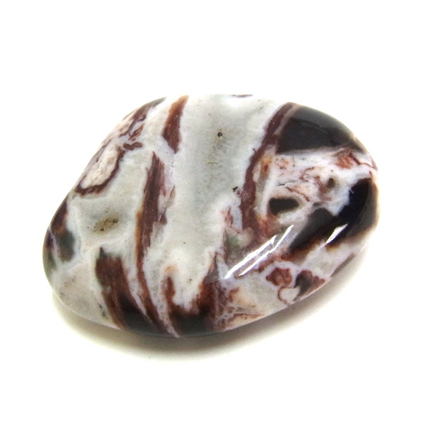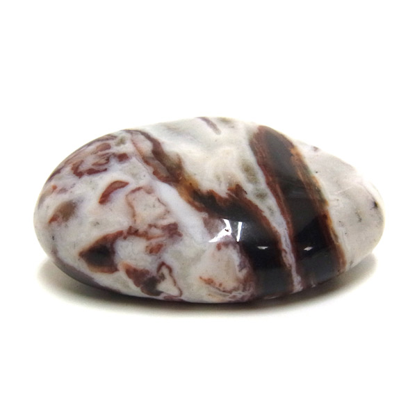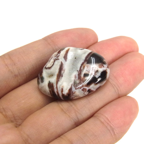 インド産のスレイマンアゲート、タンブルです。 スレイマンアゲートは白黒模様が特徴で縞メノウ(天眼石)の仲間です。 独特で縞メノウと結晶化した二酸化ケイ素含む水溶液が周期的に沈殿し、そのたびごとに不純物が取り込まれ、層状に結晶化したものです。白い部分が多いスレイマンアゲートはより稀少になります。