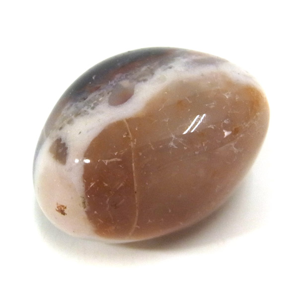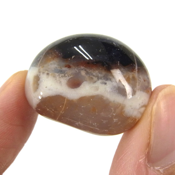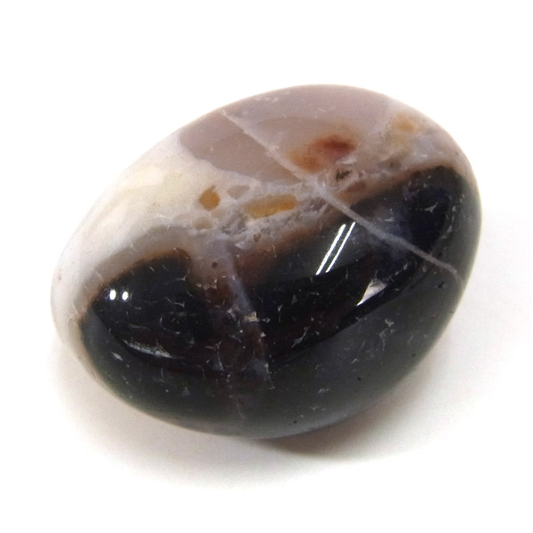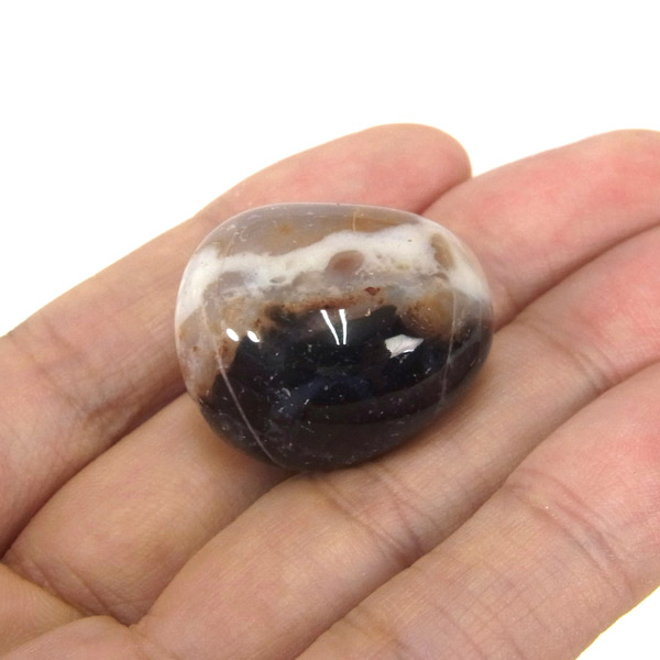 インド産のスレイマンアゲート、タンブルです。 スレイマンアゲートは白黒模様が特徴で縞メノウ(天眼石)の仲間です。 独特で縞メノウと結晶化した二酸化ケイ素含む水溶液が周期的に沈殿し、そのたびごとに不純物が取り込まれ、層状に結晶化したものです。白い部分が多いスレイマンアゲートはより稀少になります。