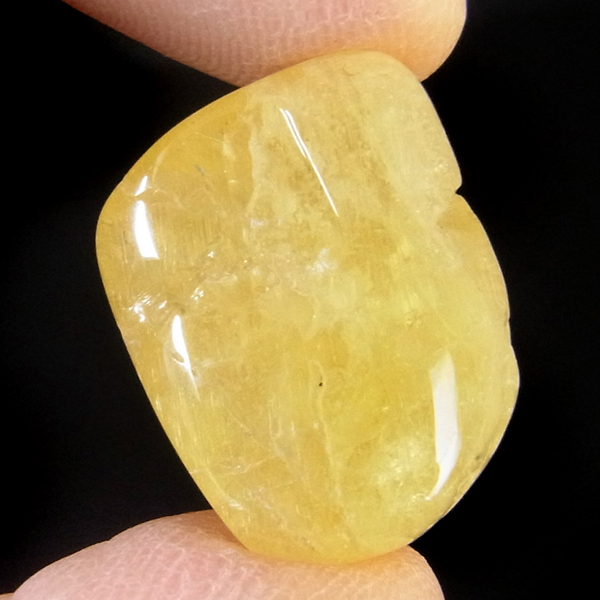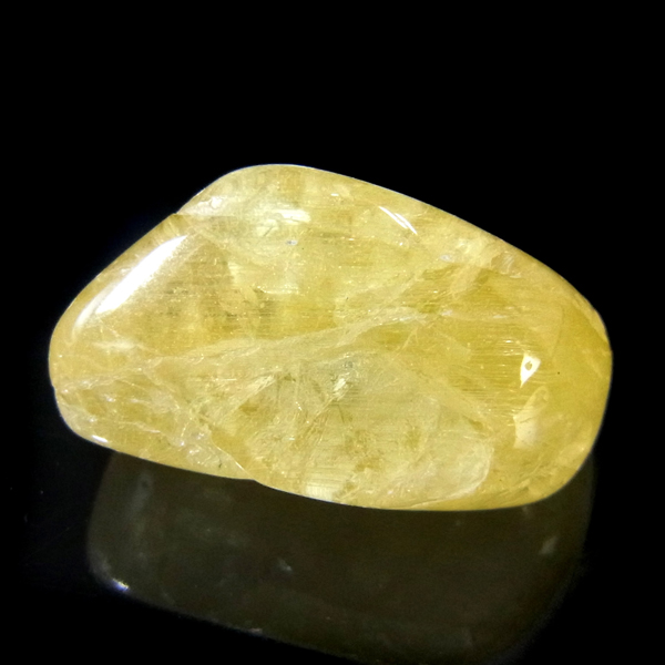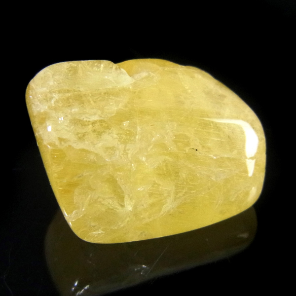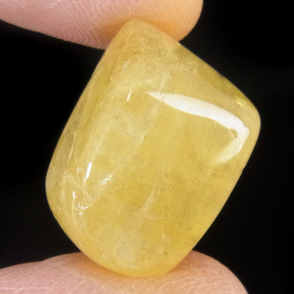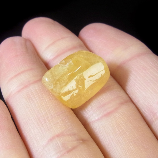 タンザニア産のゴールデンダンビュライト、タンブルです。ダンビュライトと言えば、透明度の高い結晶や、薄いピンク色の結晶がよく知られています。 光の反射が強く 屈折率が高いことから、良質な原石をカットすると水晶やトパーズよりも透明で澄んでいて、かつてダイアモンドの代用品として利用されていたこともあります。 ところが、タンザニアで産するダンビュライトは 明るいイエローの発色で、塊状で産するのが特徴です。 ゴールデンダンビュライトは非常に希少価値が高く、インペリアルトパーズよりも稀少というほどです。 透明度を伴う美しいものになると、イエローを通り越してまさにゴールドに映える、いつまでも眺めていたくなる逸品です。