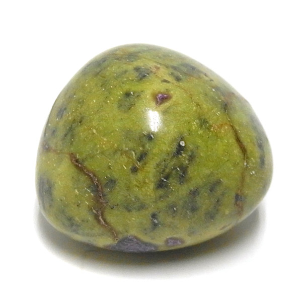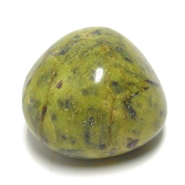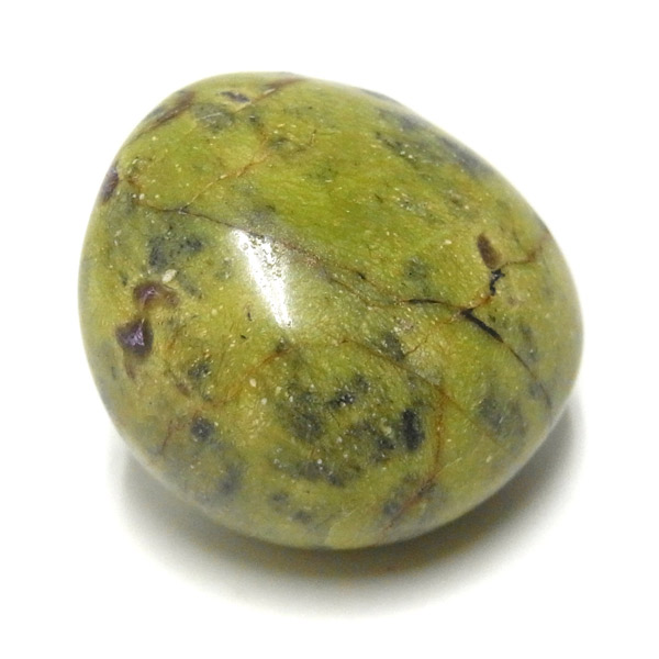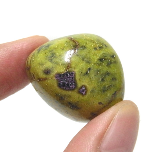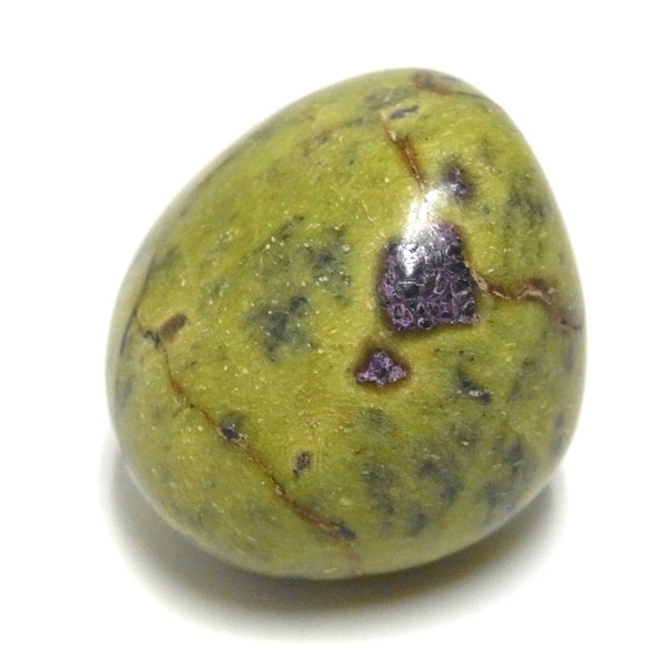 アトランティサイト、タンブルです。 鮮やかな黄緑のサーペンティン(リザーダイド)に、またまた鮮やかな紫色のスティクタイトが点々と彩りを添え、鮮やかな色彩のハーモニーが印象的です。クリスタルヒーラーのメロディ氏によって紹介されたヒーリングストーンのひとつです。産地に因んでタスマナイトとも呼ばれています。アトランティサイトの名の由来は、伝説の大国「アトランティス」から。この叡智にアクセスできるというこの奇跡のクリスタルは、ヒーリングの分野のみならず、標本業界にも多大なインパクトを与えました。大変希少性が高く近年流通量が減少しつつあるパワーストーンの一つとなります。