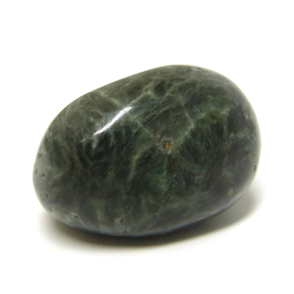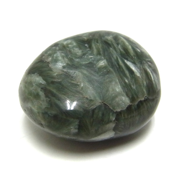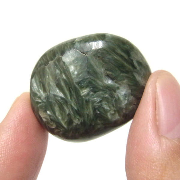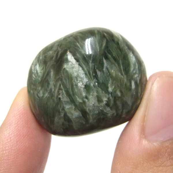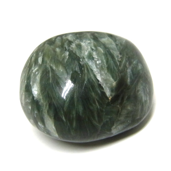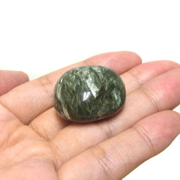 ロシア産セラフィナイト、タンブルです。美しいグリーンを持つセラフィナイト、色の濃淡が大変美しく、濃いグリーンの部分から白い羽根が舞い落ちるような模様になっています。角度によって輝きが変化するシルバーの雲母もこのセラフィナイトの美しさを引き立てています。