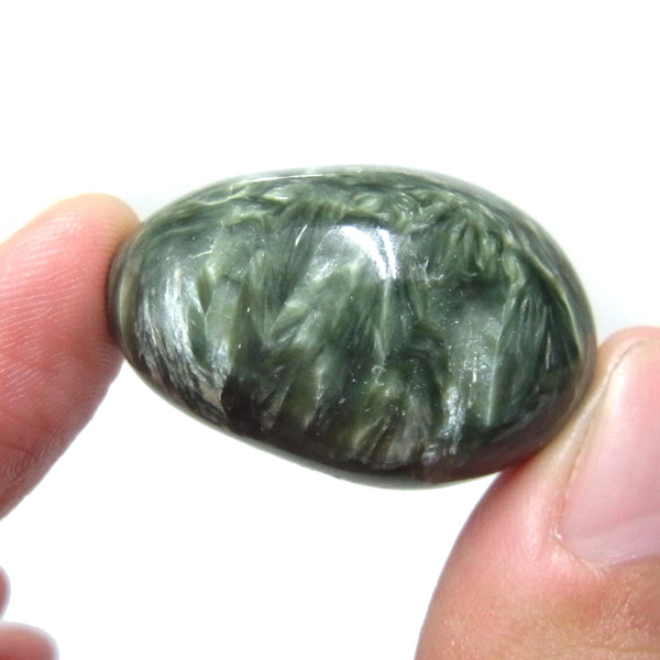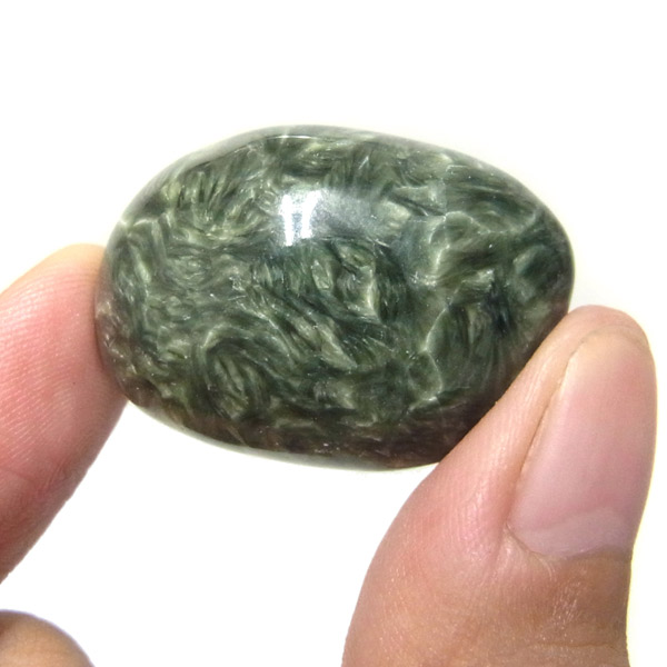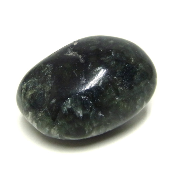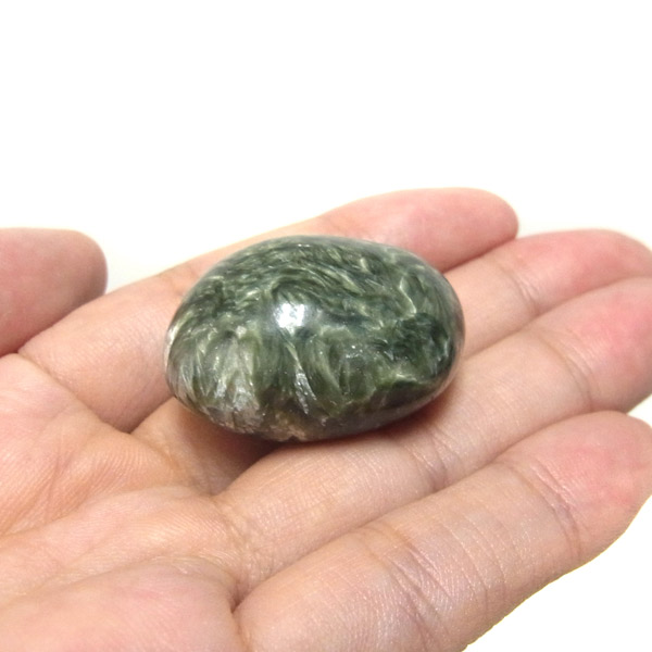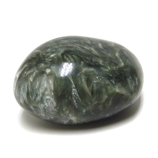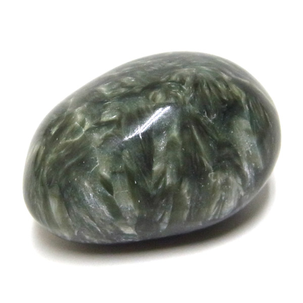 ロシア産セラフィナイト、タンブルです。美しいグリーンを持つセラフィナイト、色の濃淡が大変美しく、濃いグリーンの部分から白い羽根が舞い落ちるような模様になっています。角度によって輝きが変化するシルバーの雲母もこのセラフィナイトの美しさを引き立てています。