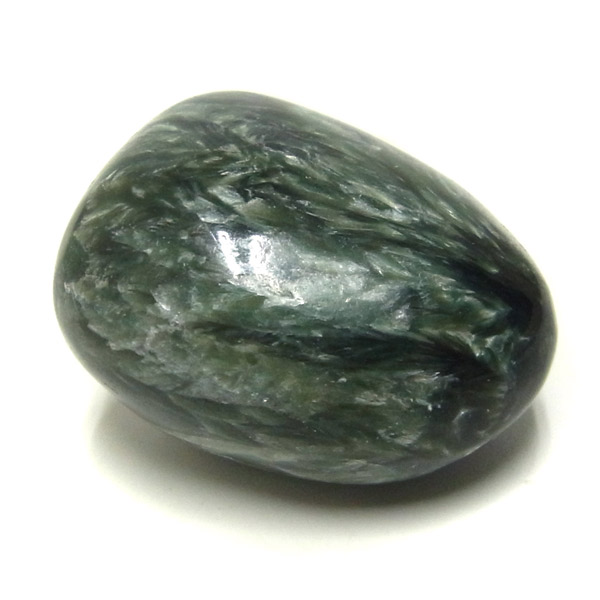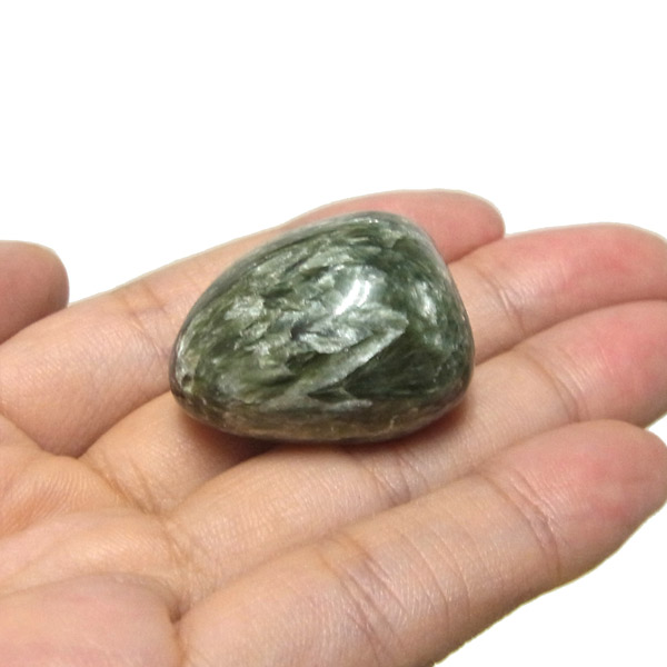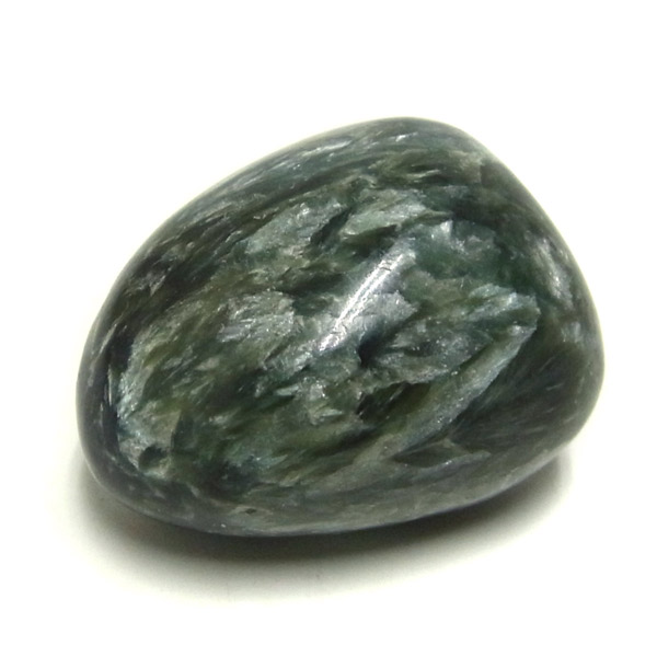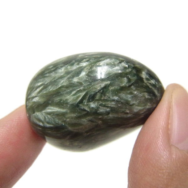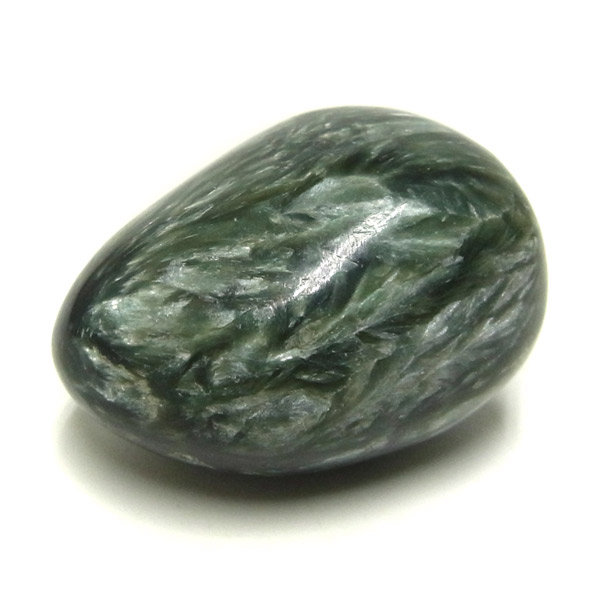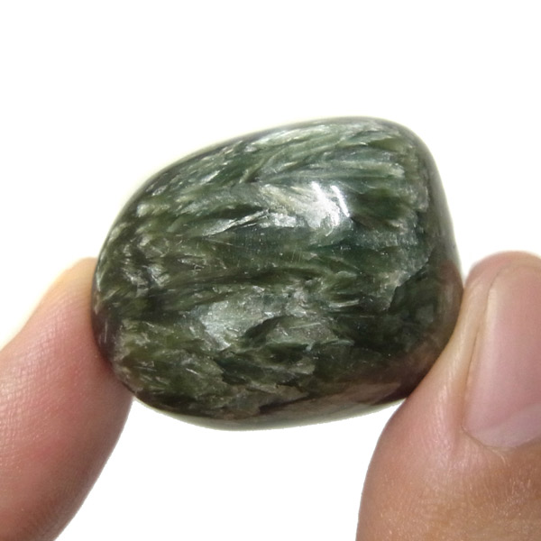 ロシア産セラフィナイト、タンブルです。美しいグリーンを持つセラフィナイト、色の濃淡が大変美しく、濃いグリーンの部分から白い羽根が舞い落ちるような模様になっています。角度によって輝きが変化するシルバーの雲母もこのセラフィナイトの美しさを引き立てています。