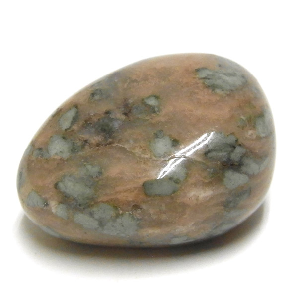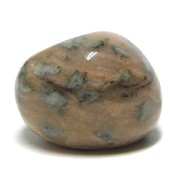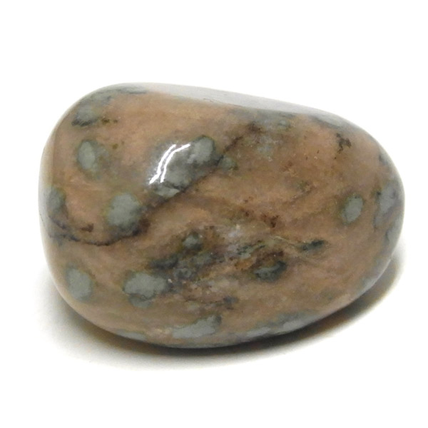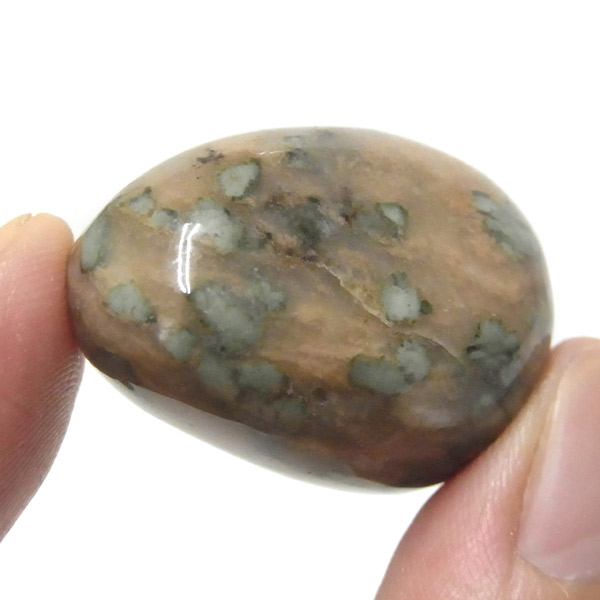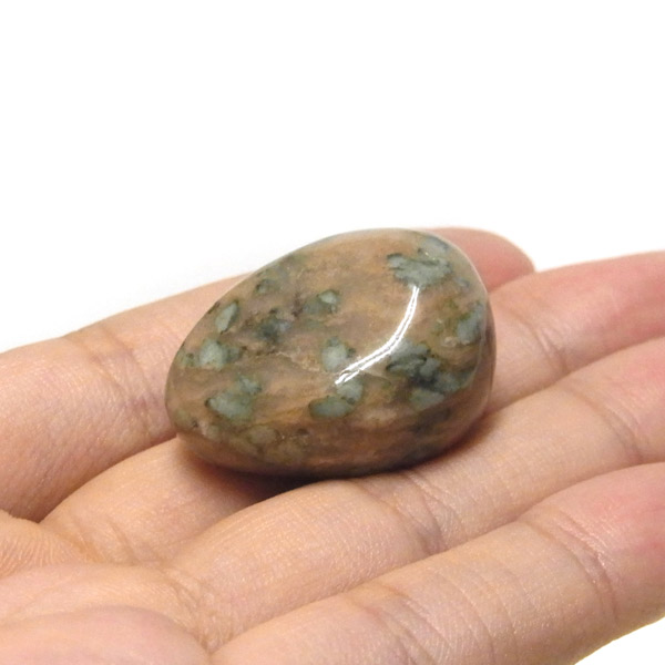 オーストラリア産のナンドライト、タンブルです。ナンドライトはオーストラリア・ニューサウスウェールズ州の小さな町ナンドルが産地である、希少であまり知られていない岩石です。ナンドライトという名前は、この産地に由来しています。ナンドライトの本質的な分類はエジリン閃長岩(エジリン・サイアナイト)にあたります。茶色やベージュ系のサイアナイト母岩の中に、深いグリーンのエジリンがドット状に散りばめられており、その独特な模様と色合いが非常に魅力的です。