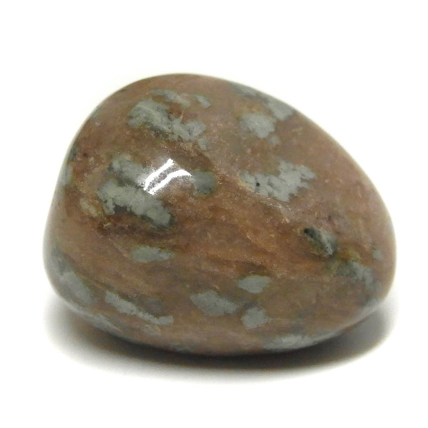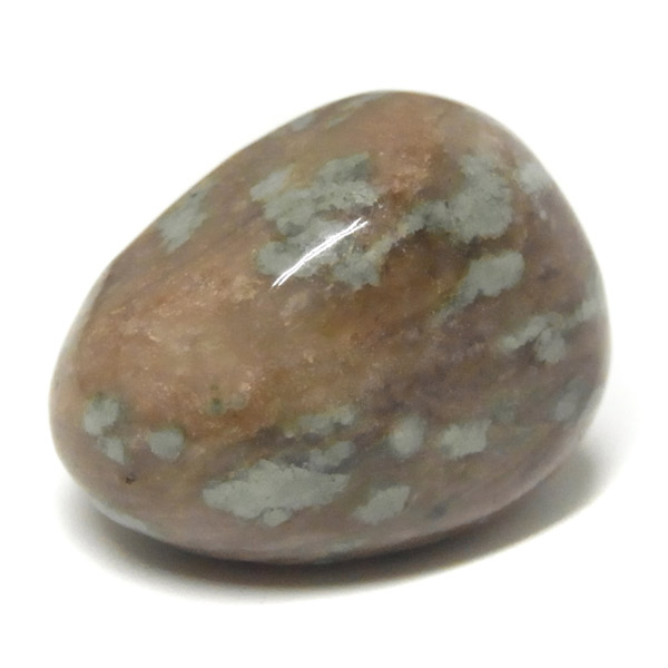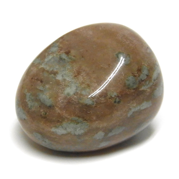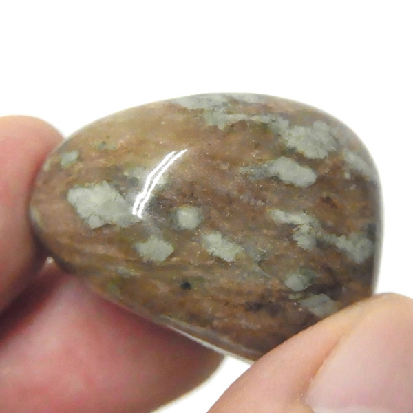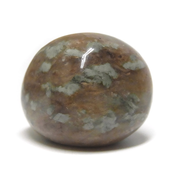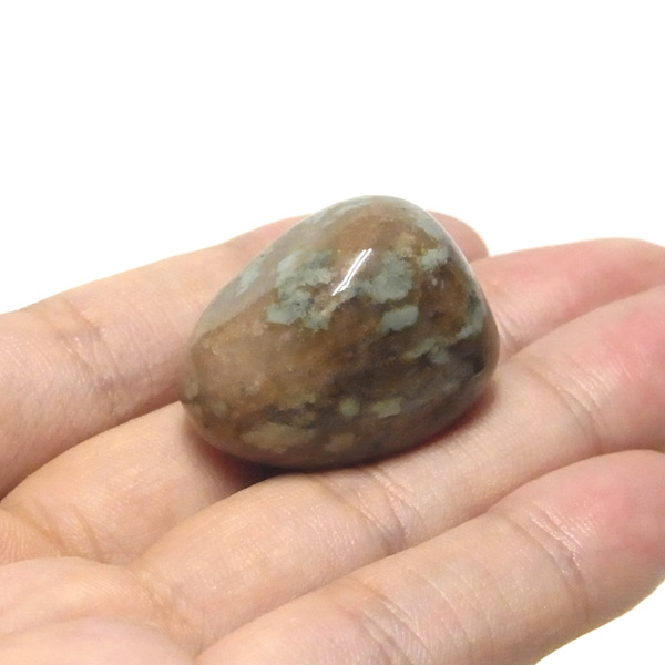 オーストラリア産のナンドライト、タンブルです。ナンドライトはオーストラリア・ニューサウスウェールズ州の小さな町ナンドルが産地である、希少であまり知られていない岩石です。ナンドライトという名前は、この産地に由来しています。ナンドライトの本質的な分類はエジリン閃長岩(エジリン・サイアナイト)にあたります。茶色やベージュ系のサイアナイト母岩の中に、深いグリーンのエジリンがドット状に散りばめられており、その独特な模様と色合いが非常に魅力的です。