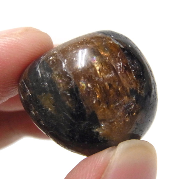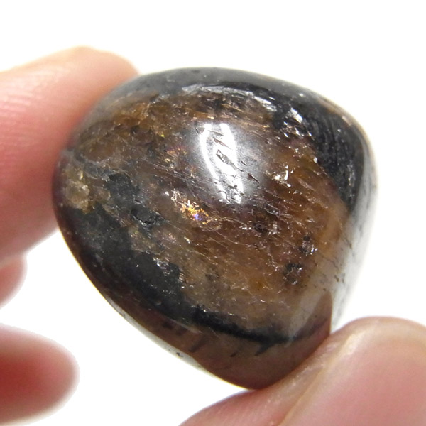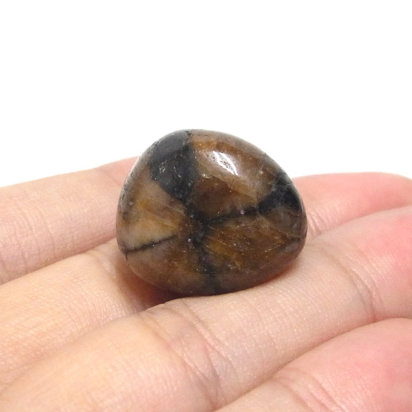 スペイン産、キャストライトタンブルです。濃いブラウンに黒の十字模様が大変魅力的な石です。 キャストライトの名前は、輪切りにすると黒い十字の模様が現れることから、ギリシャ語で「対角線的な配列」という意味の「Chiastos」に由来しています。 キャストライトは、黒鉛(グラファイト)などの黒色含有物を対称的に含んだ紅柱石です。クロスストーンとも呼ばれ、粘板岩と花こう岩の接触部に産出します。 今回ご用意した商品は、見事な十字がハッキリと見える最高ランクのものです。また、結晶がキラキラと美しく、角度によってはレインボーが見えるものもございます。