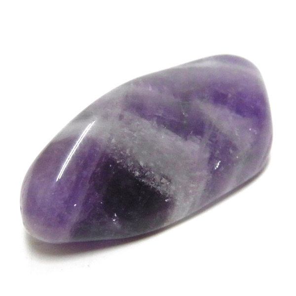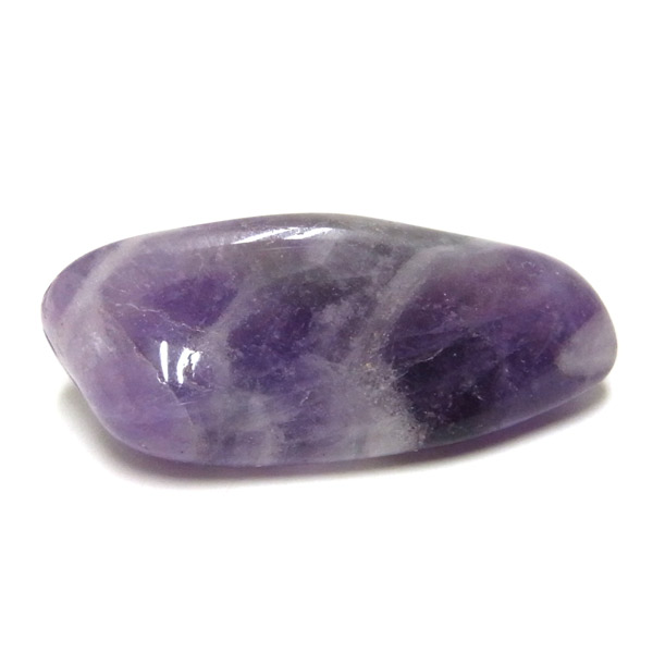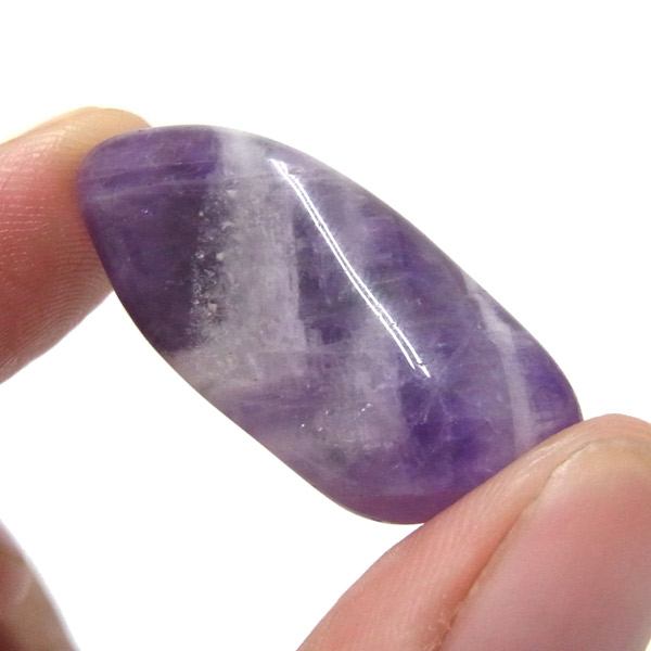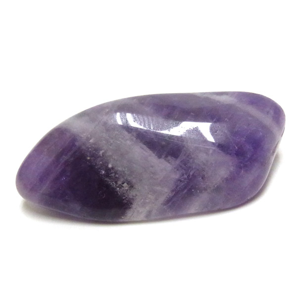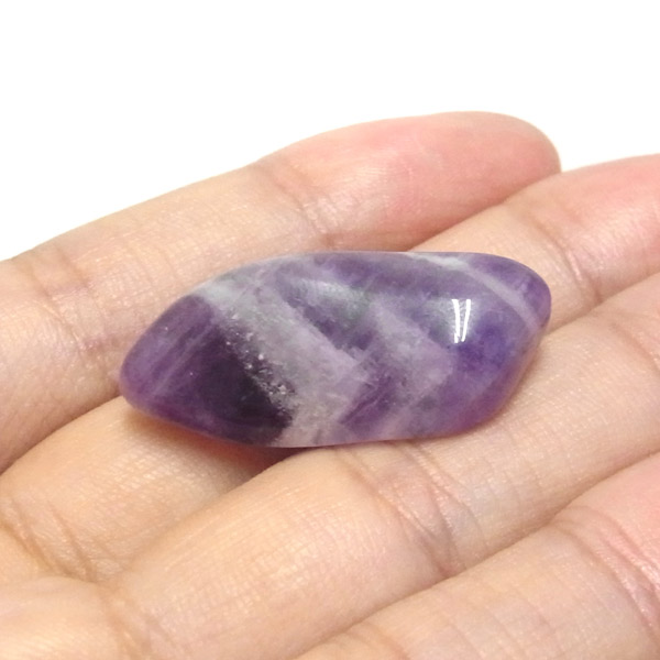 ブラジル産、シェブロンアメジストのタンブルです。 シェブロンとは、層状の紋章模様がギザギザと山形に見えることから、山を意味する言葉です。 シェブロンアメジストは、濃淡のある紫色のアメジストと、細い線状の白色をした石英が交互に重なりながら層状に成長し、このような模様が形成されているのです。 見事にハッキリとしたVの字が、大変美しいアメジストです。 ヒーリングの世界でも、大変すぐれた物とされて重宝されているそうです。