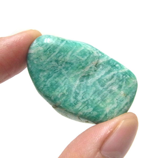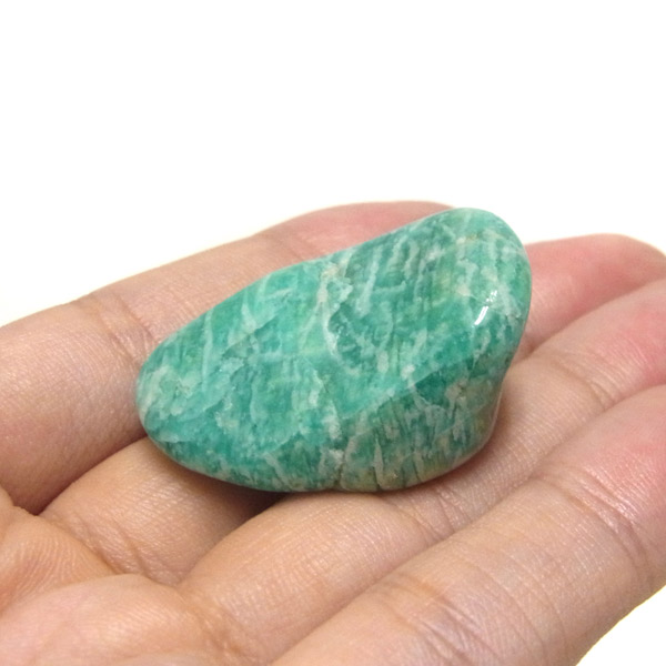 ロシア産のアマゾナイト、タンブルです。アマゾナイトといえば、世界中で広く産地が分布しています。 産地により特徴も様々で、一般的にはロシア産のアマゾナイトは、グリーンに霜を降ったような白の発色が美しいことが特徴です。 ミントをイメージする清々しいグリーンが大変人気の石です。