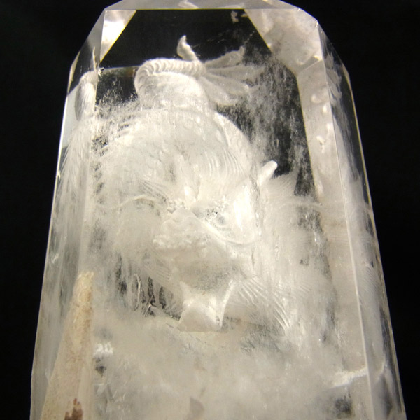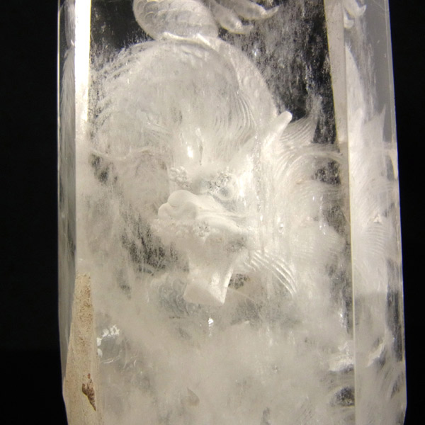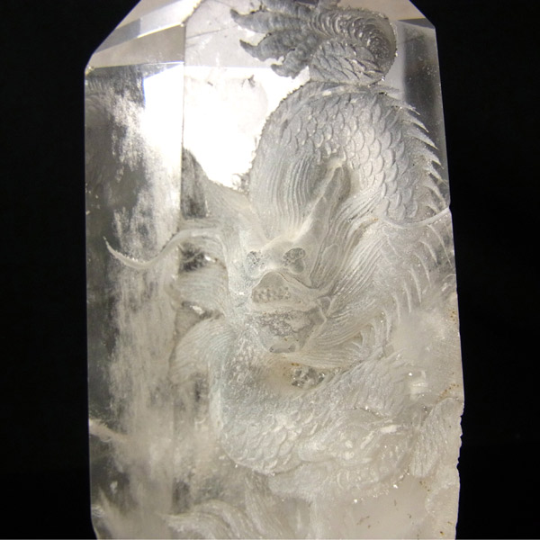 龍彫り水晶ポイントです。水晶の裏から龍を彫っています。透明感のあるきれいな水晶ポイントのに丁寧に龍が彫り込まれた一品です。上質な透明な水晶が非常にきれいです。水の生き物である龍には水晶が相性抜群。風水や縁起物としておススメです。