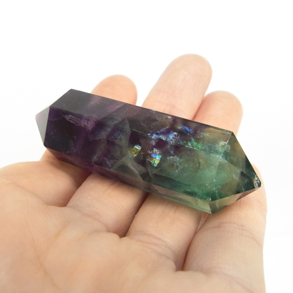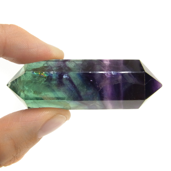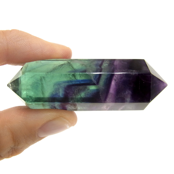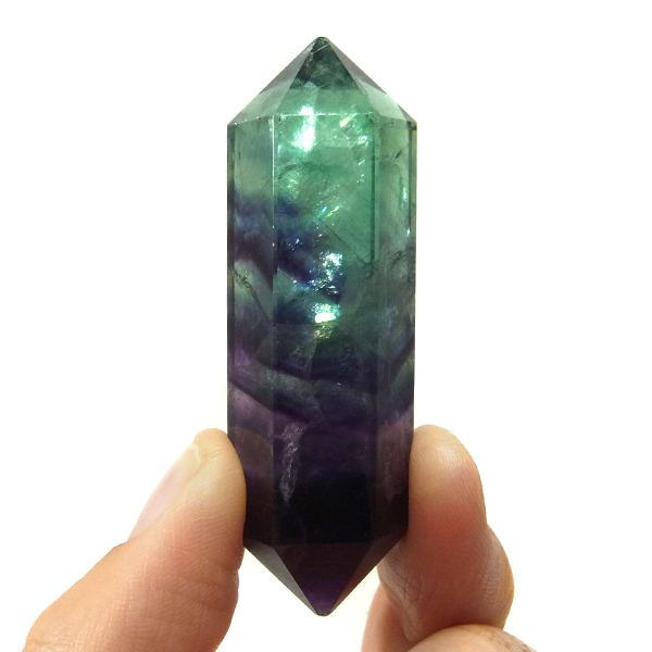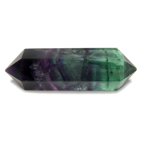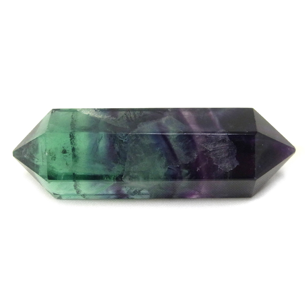 チャイナ産のフローライトポリッシュダブルポイントです。チャイナ産のフローライトは塊状で色合いが層になって現れます。それを磨きあげることで、まこときれいなフローライトのアイテムになります。ダブルポイントは中央を握ることでフローライトのパワーを感じられ、両先端から悪いものを浄化して放出してくれるとされています。天然鉱物とは思えないほどの絵具で色を混ぜたようなきれいな色合い。光に透かすとステンドグラスのようでより一層きれいです。