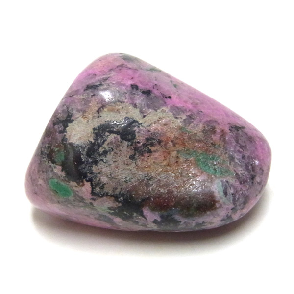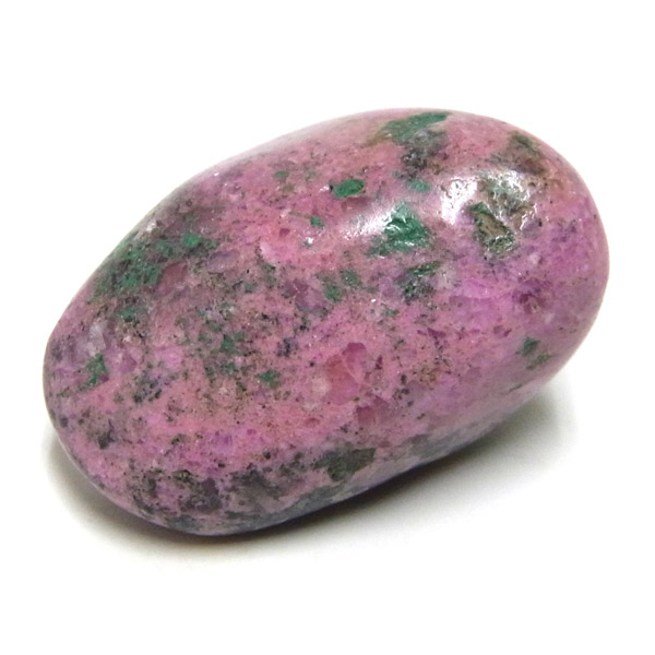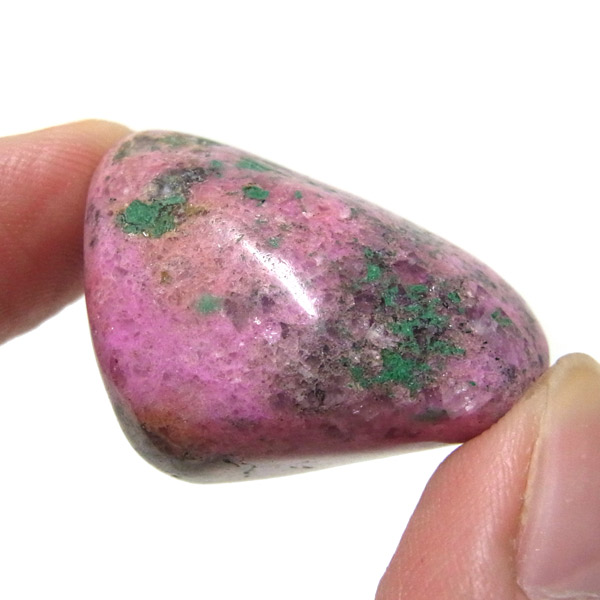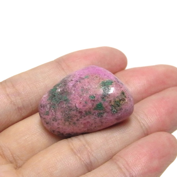 コンゴ産のコバルトカルサイト、タンブルです。コバルトカルサイトと言えば、モロッコが世界的に有名な産地ですが、コンゴ産と言えば比較的 新しい産地で ここ近年注目が高まっている新産地です。 コンゴ産の特徴はコバルト特有なビビットなピンクで、細やかな結晶はキラキラと美しく輝き、母岩を覆い尽くすように結晶しています。更に、コバルト系の鉱物にも関わらず、マラカイト・クリソコラ・パイライト・スクテルド鉱など様々な鉱物が混入するユニークなものです。これはモロッコ産にはまったく見られない特徴で、コンゴ産ならではのものといってよいでしょう。