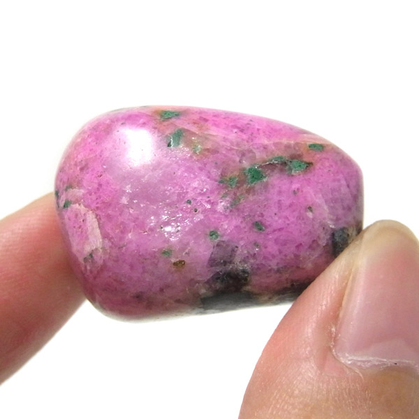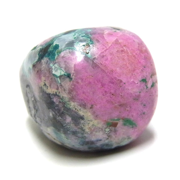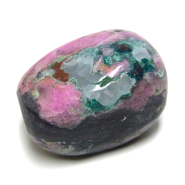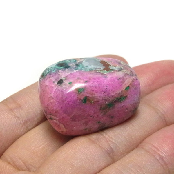 コンゴ産のコバルトカルサイト、タンブルです。コバルトカルサイトと言えば、モロッコが世界的に有名な産地ですが、コンゴ産と言えば比較的 新しい産地で ここ近年注目が高まっている新産地です。 コンゴ産の特徴はコバルト特有なビビットなピンクで、細やかな結晶はキラキラと美しく輝き、母岩を覆い尽くすように結晶しています。更に、コバルト系の鉱物にも関わらず、マラカイト・クリソコラ・パイライト・スクテルド鉱など様々な鉱物が混入するユニークなものです。これはモロッコ産にはまったく見られない特徴で、コンゴ産ならではのものといってよいでしょう。