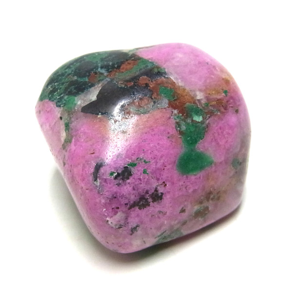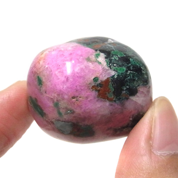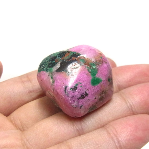 コンゴ産のコバルトカルサイト、タンブルです。コバルトカルサイトと言えば、モロッコが世界的に有名な産地ですが、コンゴ産と言えば比較的 新しい産地で ここ近年注目が高まっている新産地です。 コンゴ産の特徴はコバルト特有なビビットなピンクで、細やかな結晶はキラキラと美しく輝き、母岩を覆い尽くすように結晶しています。更に、コバルト系の鉱物にも関わらず、マラカイト・クリソコラ・パイライト・スクテルド鉱など様々な鉱物が混入するユニークなものです。これはモロッコ産にはまったく見られない特徴で、コンゴ産ならではのものといってよいでしょう。