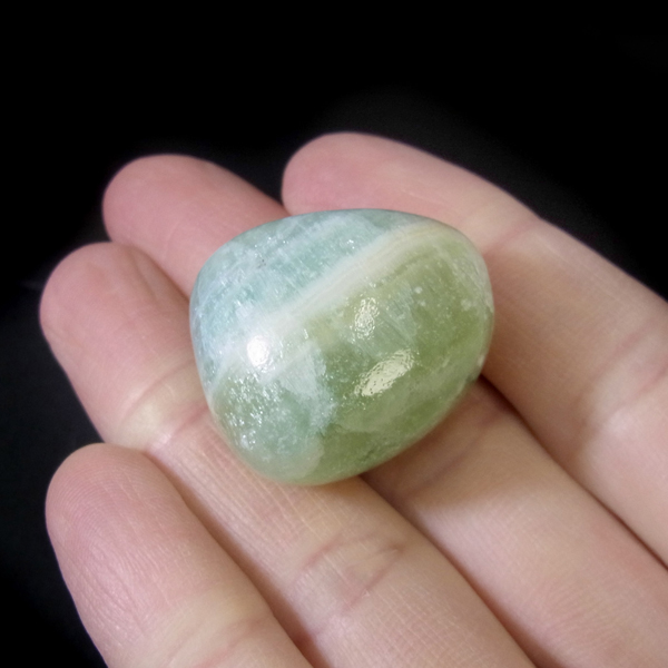 パキスタン産グリーンカルサイト、タンブルです。パキスタン産のグリーンカルサイトは、淡いグリーンが特徴的で癒されます。淡いグリーンともブルーともいえる色味でとてもかわいらしいです。グリーンカルサイトはもともと埋蔵量が少ないのですが、現在、鉱山付近は紛争地帯のため、採掘活動を停止しています。そのため、今回ご紹介しているグリーンカルサイトは大変希少な石となっています。
