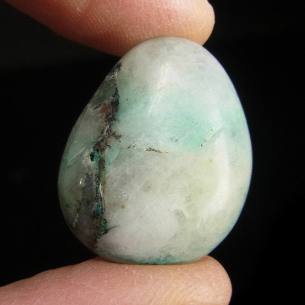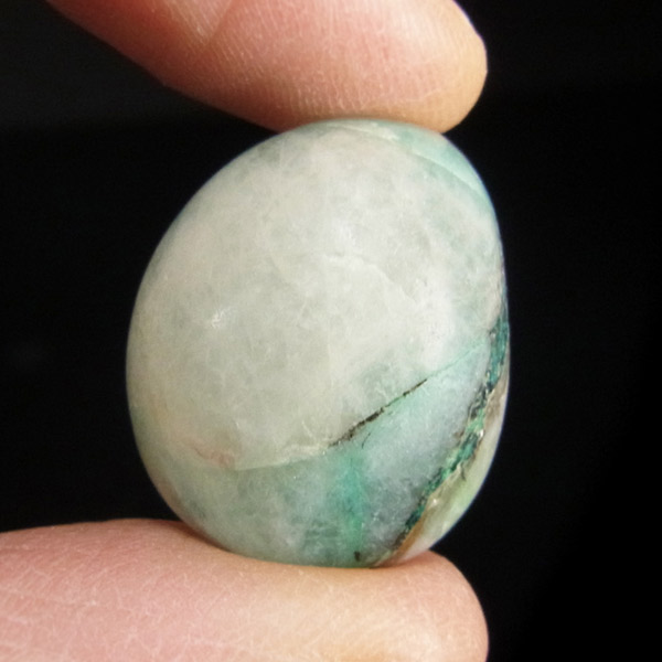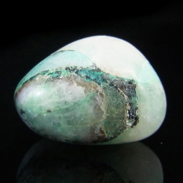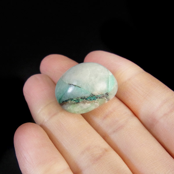 ペルー産ジェムシリカ、タンブルです。ジェムシリカとは、クリソコラをベースに水晶(石英)が長い年月をかけて混じりあったものです。非常に貴重で、限られた条件の下でしか生成されないため産出量が極めて少ない鉱物です。
