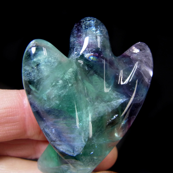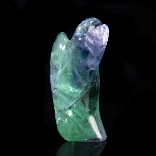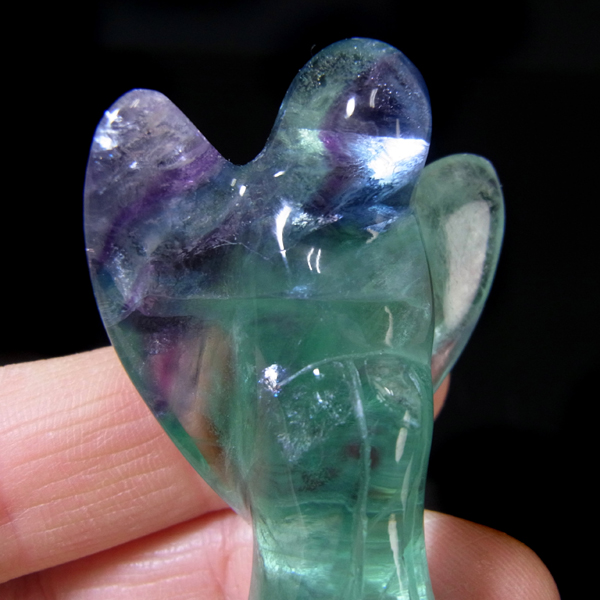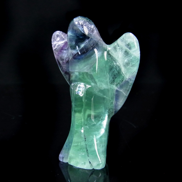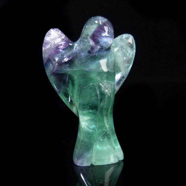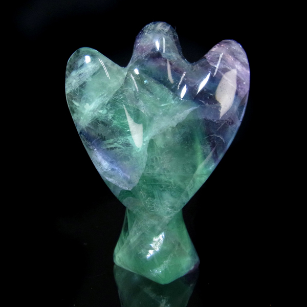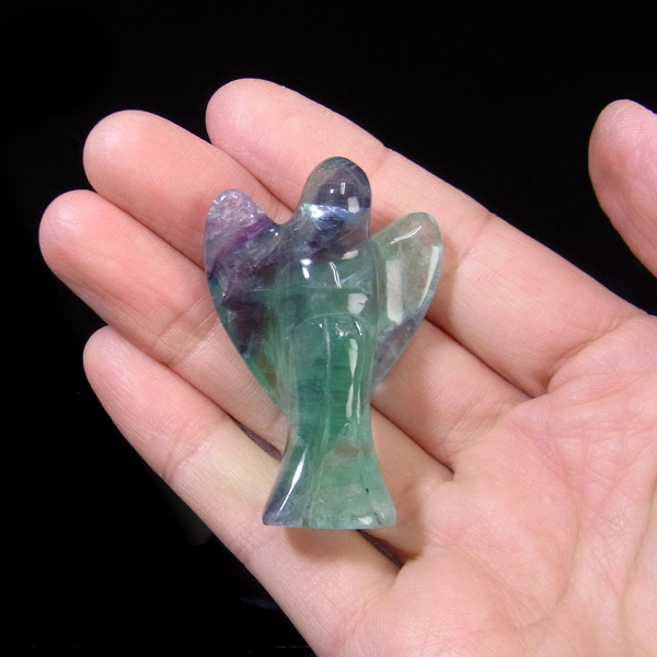 チャイナ産のグリーンフローライト、エンジェルです。透明感のあるグリーンとクリアのフローライト、パープルの層もあります。羽や頭、胸などに分かりやすいレインボーが確認できます。手のひらでちょうど持てるぐらいの大きさで石のパワーを感じたり、飾って癒されたりすると良いかと思います。何より美しいですので、疲れた時などに、見て、触って、頭をすっきりさせてくれるようなフローライトの特有のものを感じて、リフレッシュしていただければと思います。神のお告げを伝える天使の存在を身近に感じられるアイテムで、可愛らしく仕上げられています。