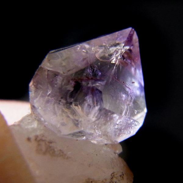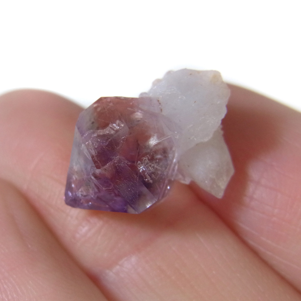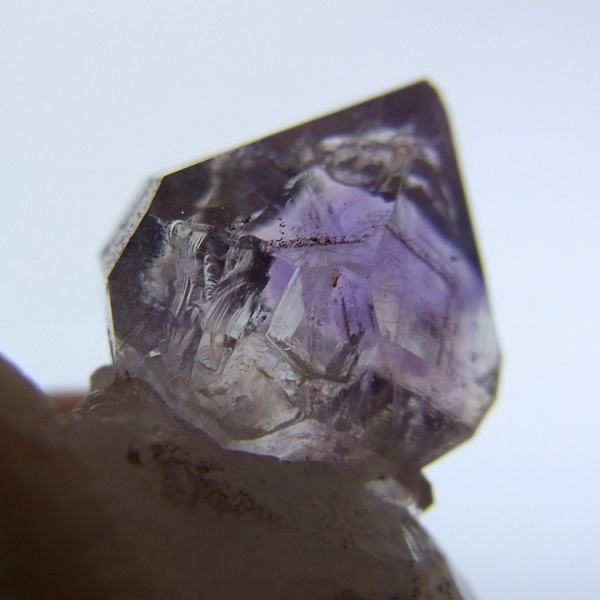 今回ご用意をしたセプタークォーツは、アメジストがかった結晶と水晶の結合です。表面に成長の証がよく見られます。先端の方に小さなレインボーが確認できました。