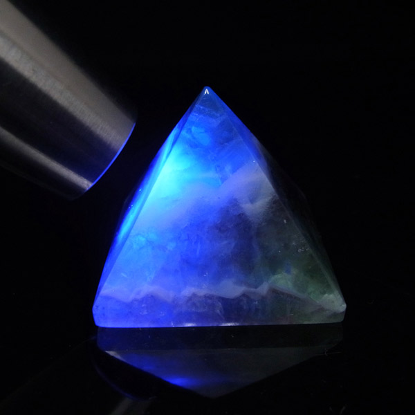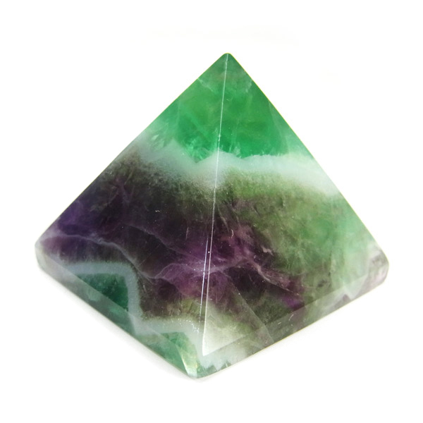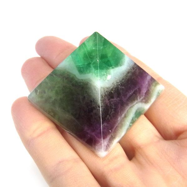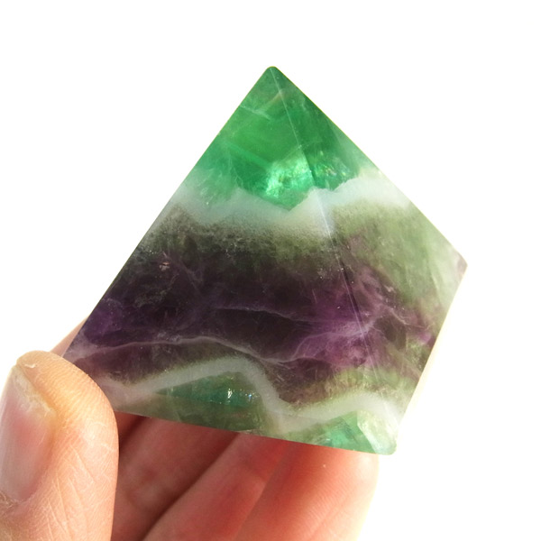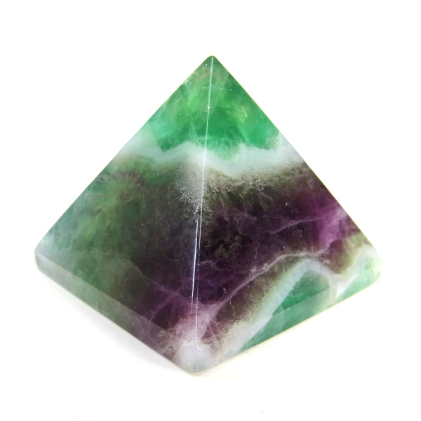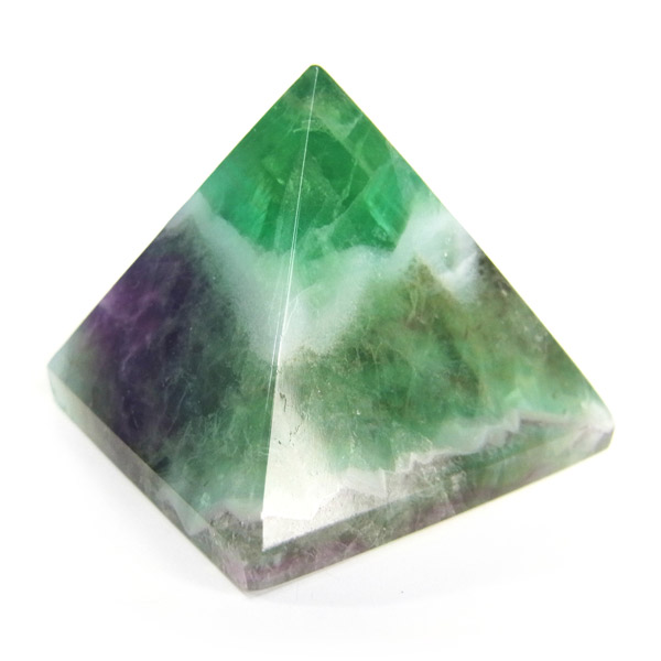チャイナ産のフローライトをピラミッド型に研磨したアイテムです。澄んだクリアなフローライトで内部の結晶まで見ることができ、とてもきれいで癒されます。複雑な色彩が神秘的で面白い表情を見せてくれます。 ピラミッド型は宇宙と深い関係があるとされる形です。心身のバランスの安定をはかり、潜在能力を高めてくれます。先端は宇宙のエネルギーを集めているといわれています。