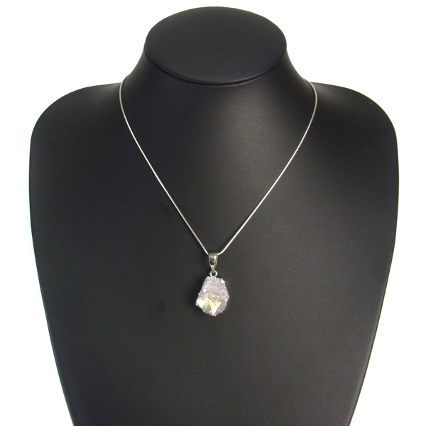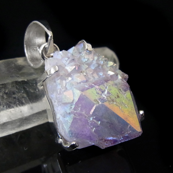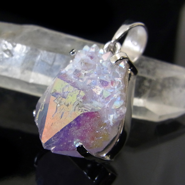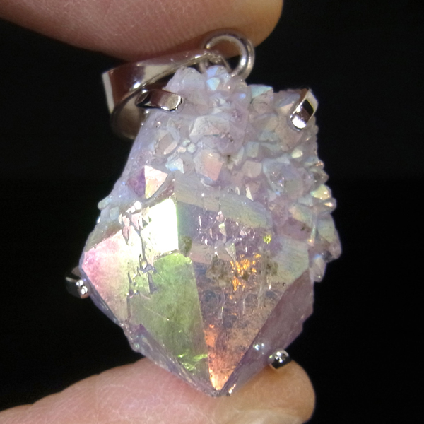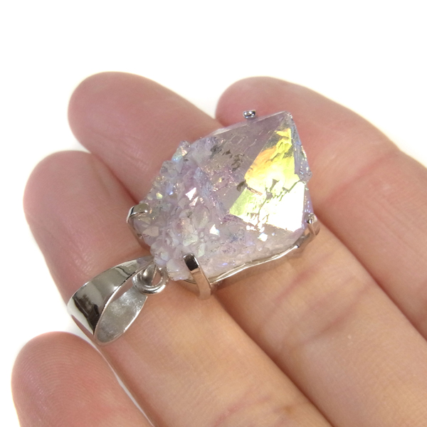南アフリカ産、オーラカクタスクォーツのペンダントトップです。カクタスクォーツは、細かな結晶に包まれるように、先端にポイントが伸びている特徴的な水晶です。カクタスとは「サボテン」という意味で、見た目がサボテンに似ていることからこの名前がつけられ、サボテン水晶とも言われています。その上にホワイトオーラと呼ばれるチタンを被膜を蒸着させています。オーラカクタスクォーツとはホワイトオーラと呼ばれている虹色の美しい光沢を纏っているカクタスクォーツのことで、オーラ処理されている石になります。比較的小ぶりなものをペンダントトップに仕上げています。虹色の変化が楽しいペンダントになっております。※チェーンは別売りです。