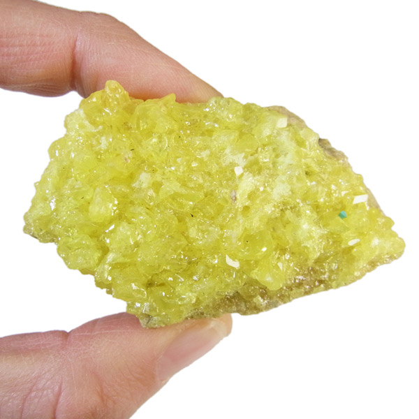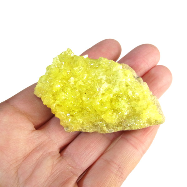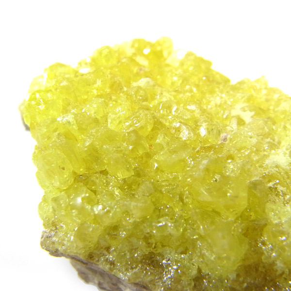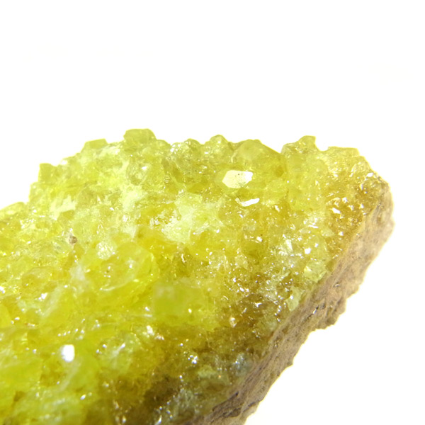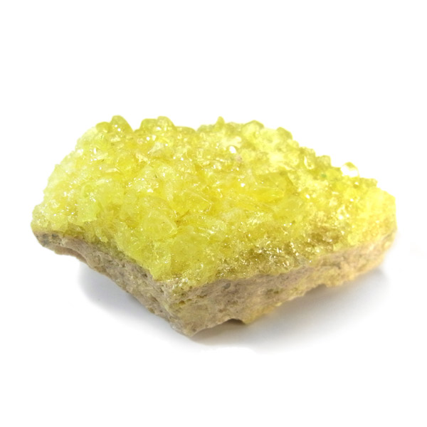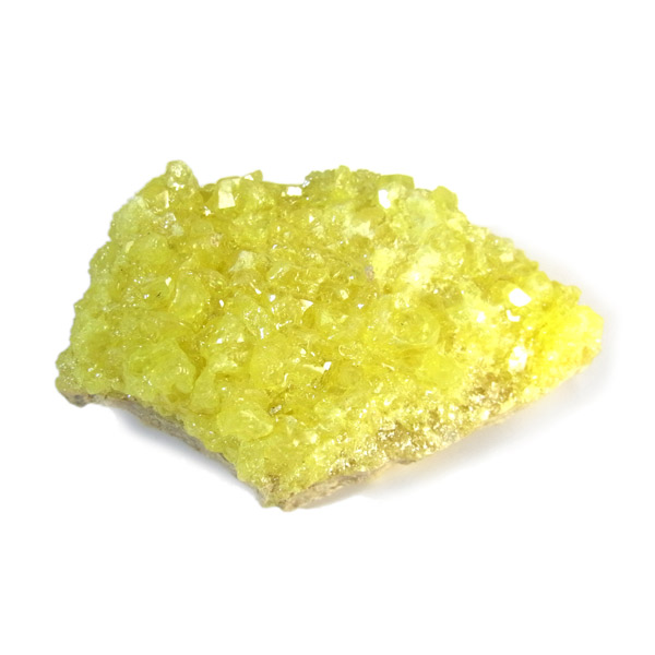 ボリビア産、サルファーの原石です。サルファーは和名で硫黄のことです。サルファーは黄色の鉱物で、火山の火口や、温泉の噴出孔付近から産出します。サルファーは、マグネシウムが豊富な環境で多く見られます。中でもボリビア産のものは、母岩の上に肉厚で鮮やかな結晶がキラキラと連なることで知られています。透明度を伴ったビビッドなイエローが綺麗で魅力的です。