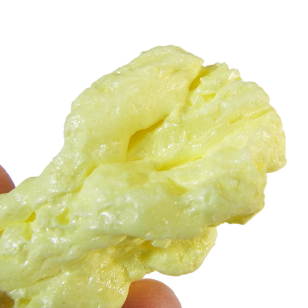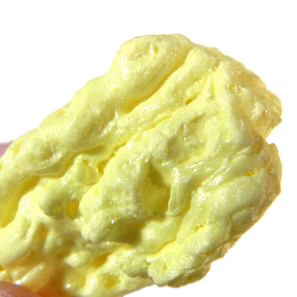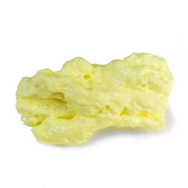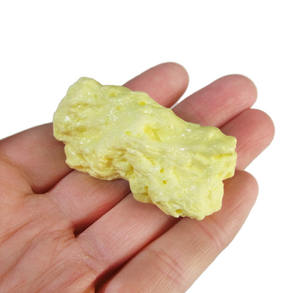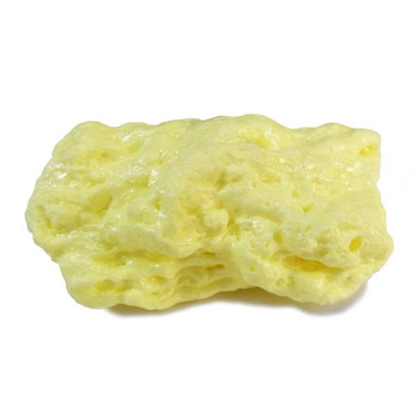 インドネシア産、サルファーの原石です。サルファーは和名で硫黄のことです。サルファーは黄色の鉱物で、火山の火口や、温泉の噴出孔付近から産出します。サルファーは、マグネシウムが豊富な環境で多く見られます。塊状で堆積した自然硫黄です。