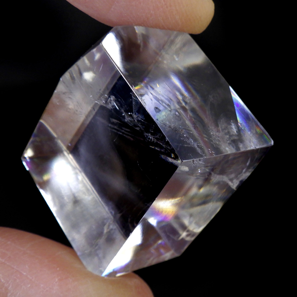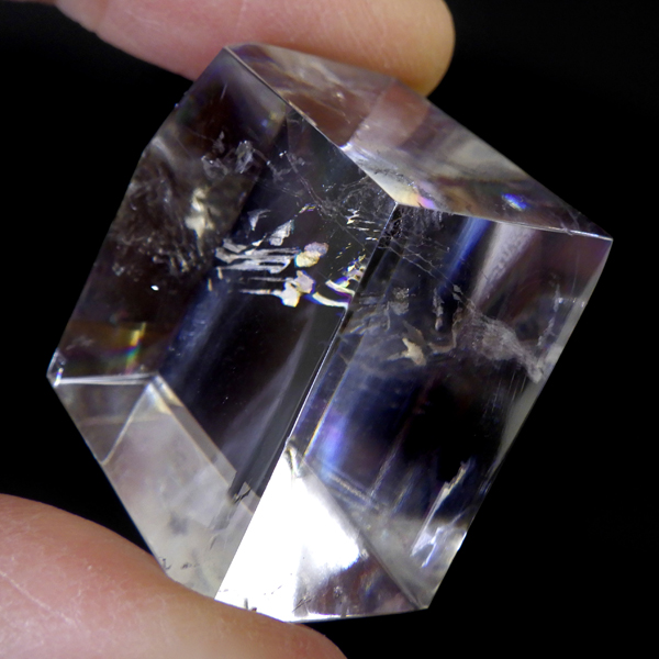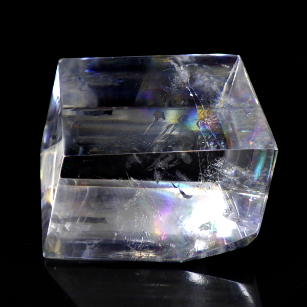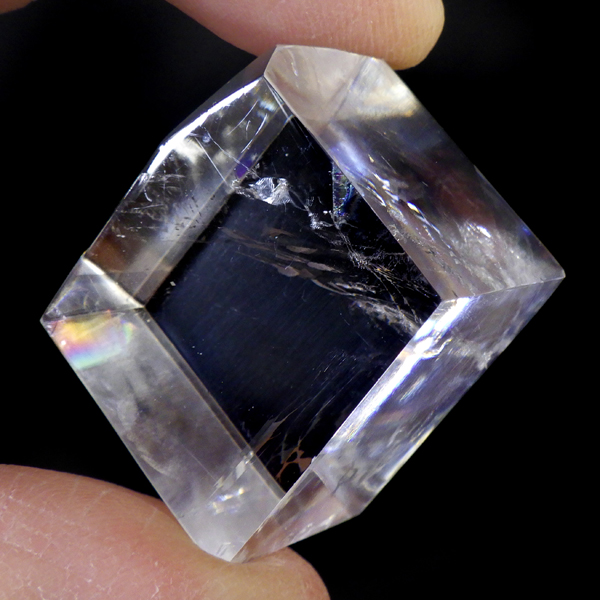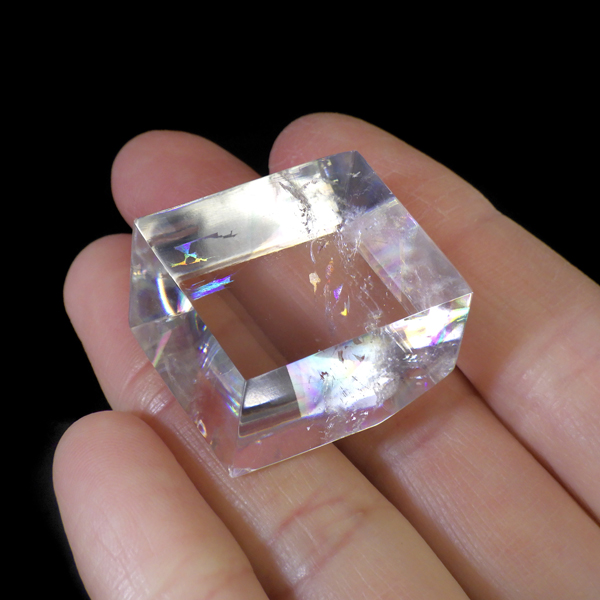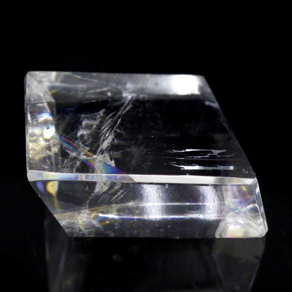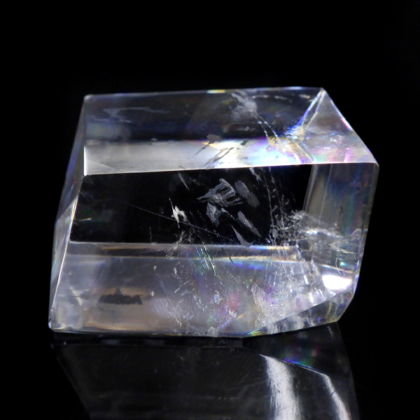 マダガスカル産のオプティカルカルサイトです。無色透明で良質のカルサイトのことをオプティカルカルサイトと呼びます。高い透明度を持ち、様々な角度からレインボーを見ることができます。複屈折という光学現象を持ち、文字の上に載せると二つにダブって見える「ダブリング(二重像現象)」のような現象を起こします。一定方向に向かって割れる劈開性によって平行四辺形の形になります。 他の産地のものよりマダガスカル産のオプティカルカルサイトはクラックが少なくきれいな印象です。