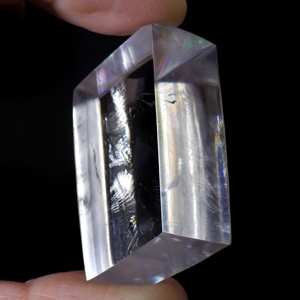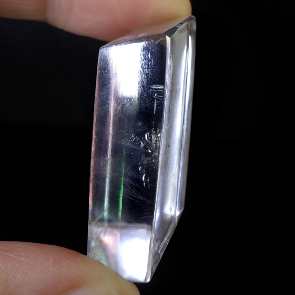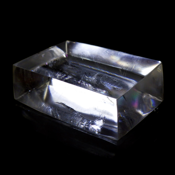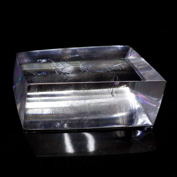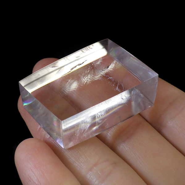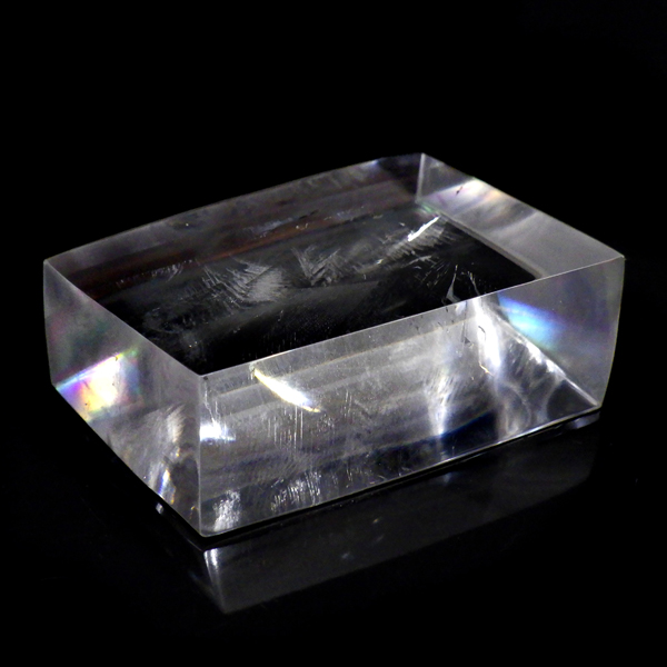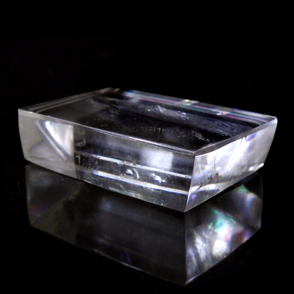 マダガスカル産のオプティカルカルサイトです。無色透明で良質のカルサイトのことをオプティカルカルサイトと呼びます。高い透明度を持ち、様々な角度からレインボーを見ることができます。複屈折という光学現象を持ち、文字の上に載せると二つにダブって見える「ダブリング(二重像現象)」のような現象を起こします。一定方向に向かって割れる劈開性によって平行四辺形の形になります。 他の産地のものよりマダガスカル産のオプティカルカルサイトはクラックが少なくきれいな印象です。