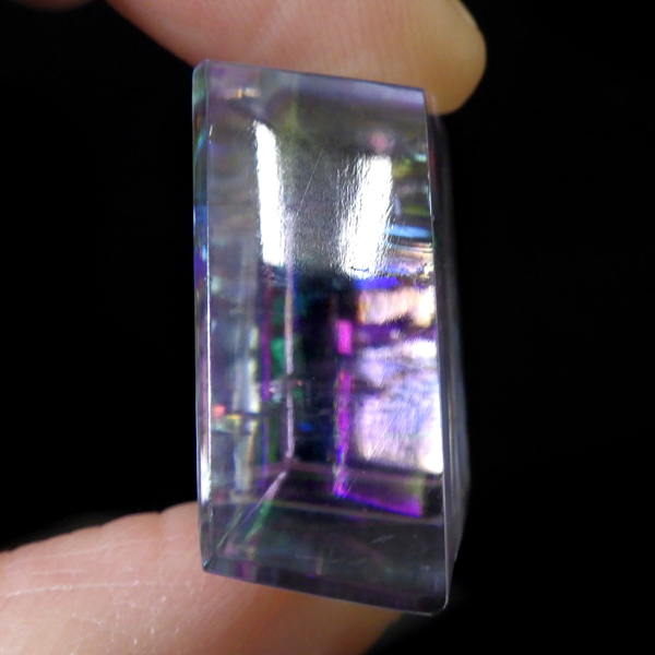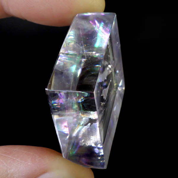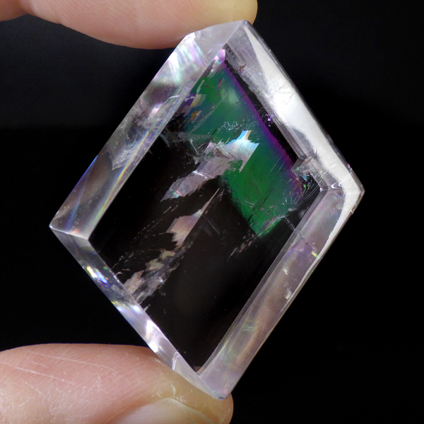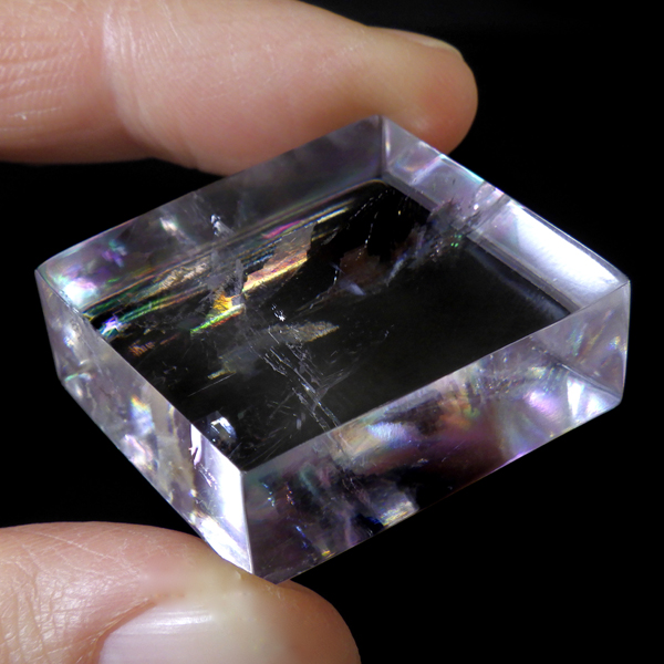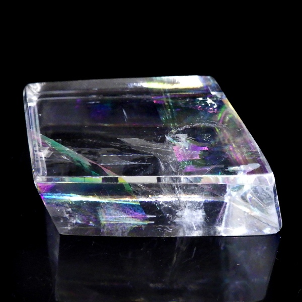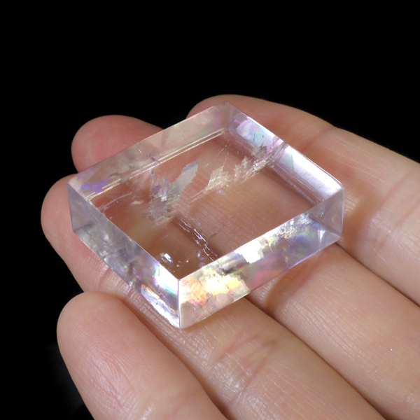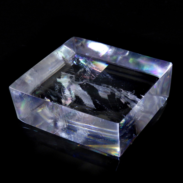 マダガスカル産のオプティカルカルサイトです。無色透明で良質のカルサイトのことをオプティカルカルサイトと呼びます。高い透明度を持ち、様々な角度からレインボーを見ることができます。複屈折という光学現象を持ち、文字の上に載せると二つにダブって見える「ダブリング(二重像現象)」のような現象を起こします。一定方向に向かって割れる劈開性によって平行四辺形の形になります。 他の産地のものよりマダガスカル産のオプティカルカルサイトはクラックが少なくきれいな印象です。