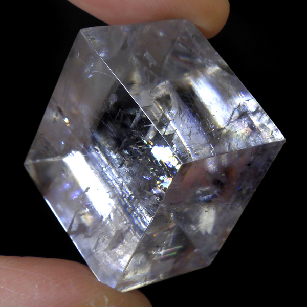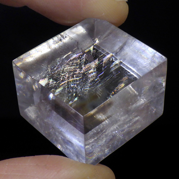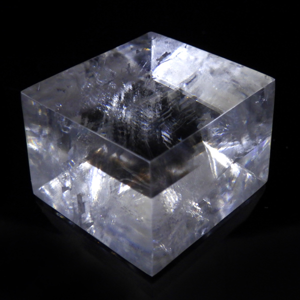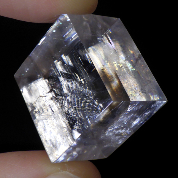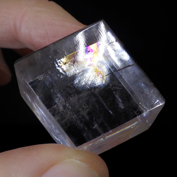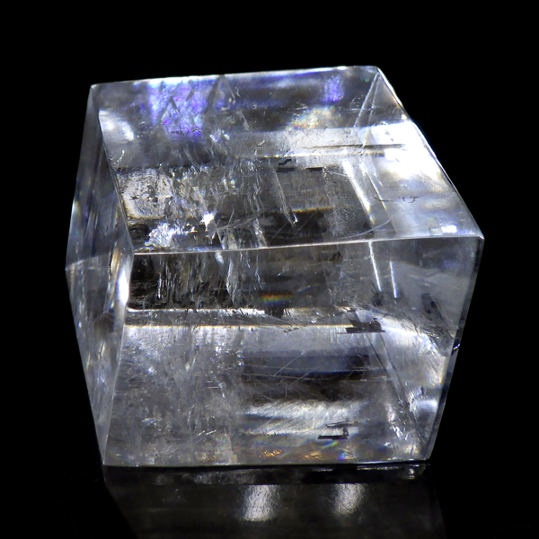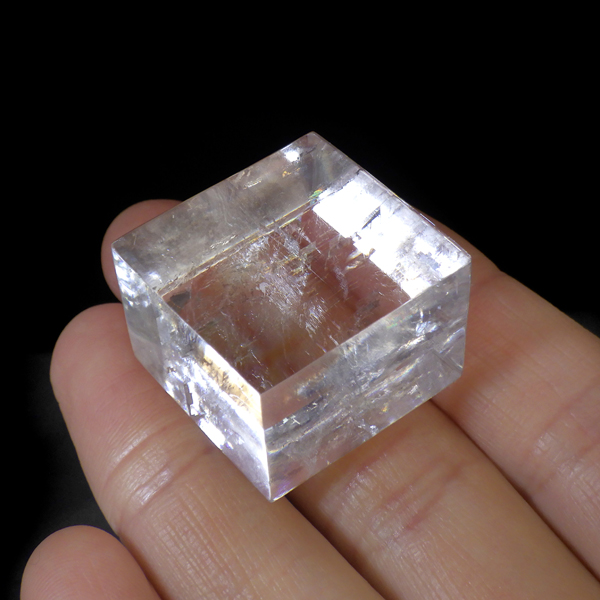 マダガスカル産のオプティカルカルサイトです。無色透明で良質のカルサイトのことをオプティカルカルサイトと呼びます。高い透明度を持ち、様々な角度からレインボーを見ることができます。複屈折という光学現象を持ち、文字の上に載せると二つにダブって見える「ダブリング(二重像現象)」のような現象を起こします。一定方向に向かって割れる劈開性によって平行四辺形の形になります。 他の産地のものよりマダガスカル産のオプティカルカルサイトはクラックが少なくきれいな印象です。