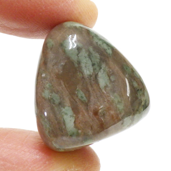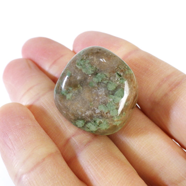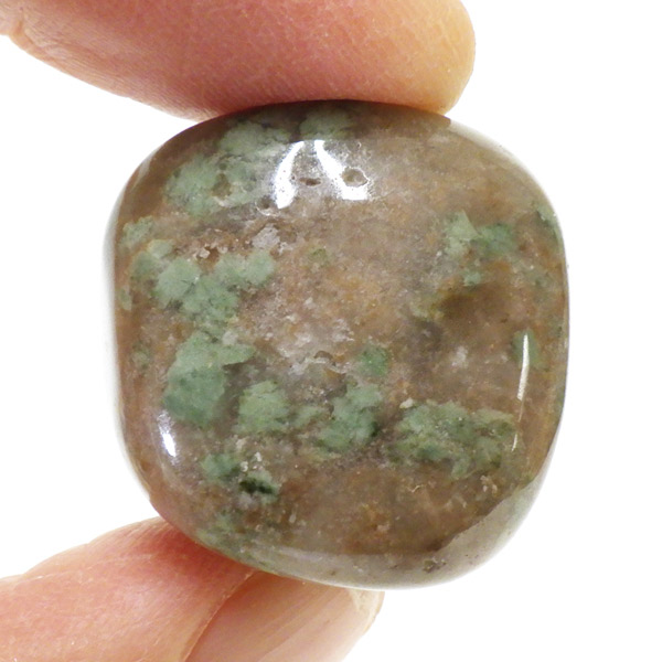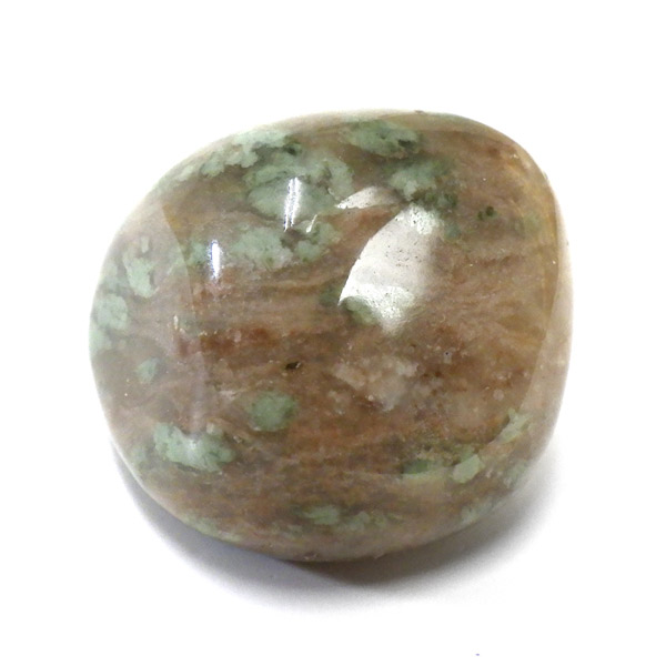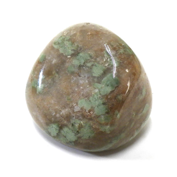 オーストラリア産のナンドライト、タンブルです。ナンドライトはオーストラリア・ニューサウスウェールズ州の小さな町ナンドルが産地である、希少であまり知られていない岩石です。ナンドライトという名前は、この産地に由来しています。ナンドライトの本質的な分類はエジリン閃長岩(エジリン・サイアナイト)にあたります。茶色やベージュ系のサイアナイト母岩の中に、深いグリーンのエジリンがドット状に散りばめられており、その独特な模様と色合いが非常に魅力的です。