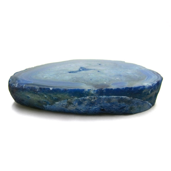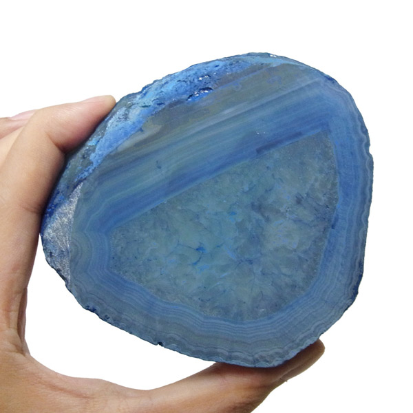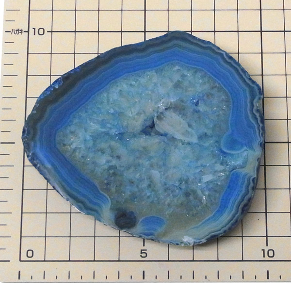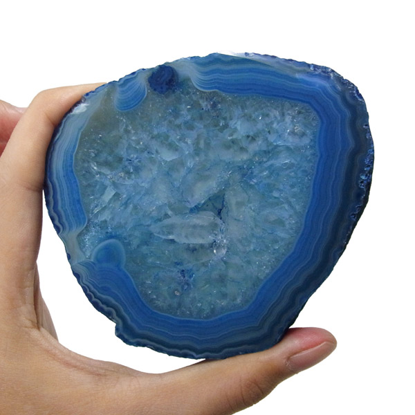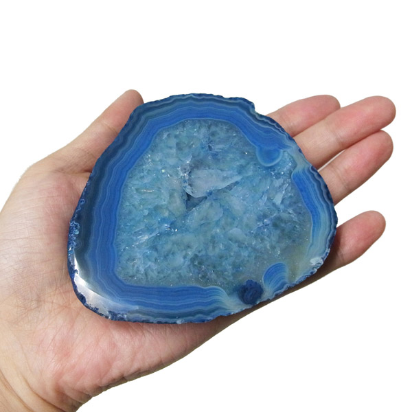 ブラジル産メノウのノジュール(塊)を真ん中でカットし、ブルーに染色し、スライスした断面を研磨した厚切りメノウスライス原石です。厚くスライスした色鮮やかなメノウスライスです。英語でアゲートと呼びます。中央には水晶がきれいに結晶しています。