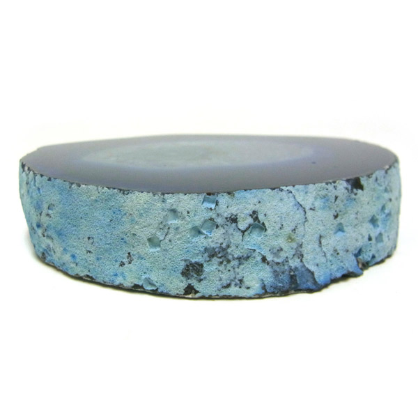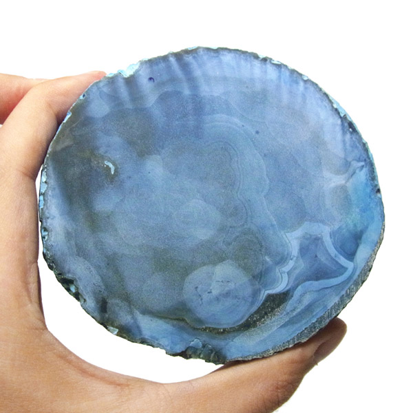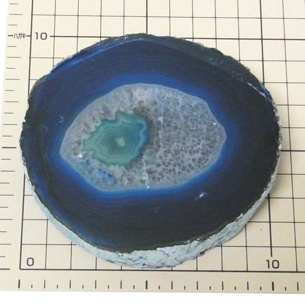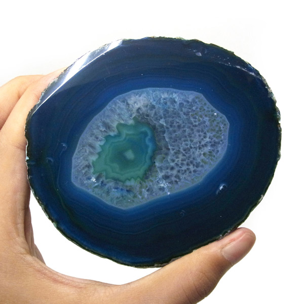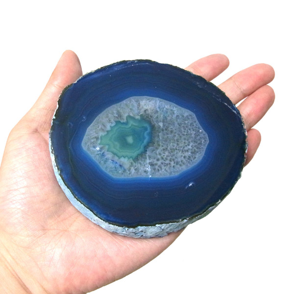 ブラジル産メノウのノジュール(塊)を真ん中でカットし、ブルーに染色し、スライスした断面を研磨した厚切りメノウスライス原石です。厚くスライスした色鮮やかなメノウスライスです。英語でアゲートと呼びます。中央には水晶がきれいに結晶しています。