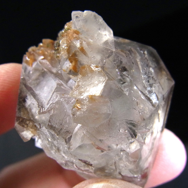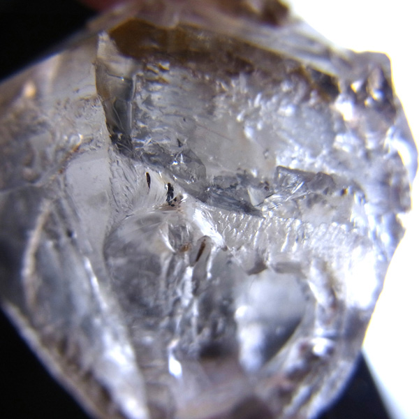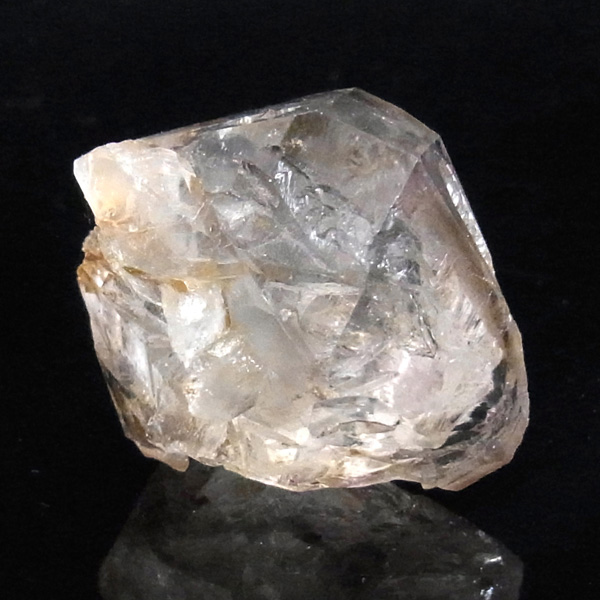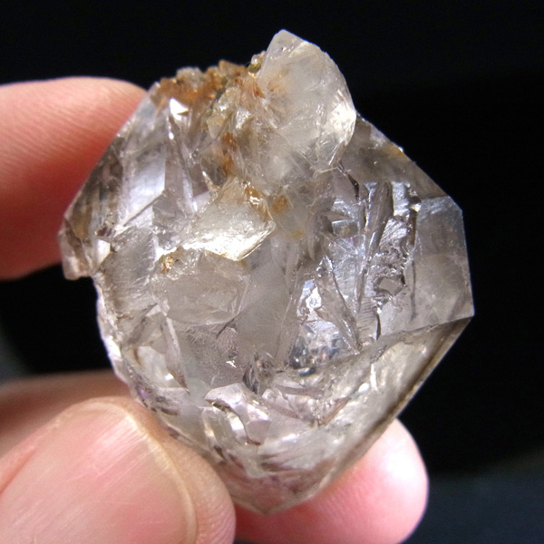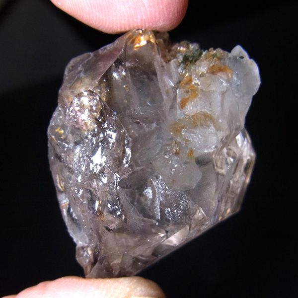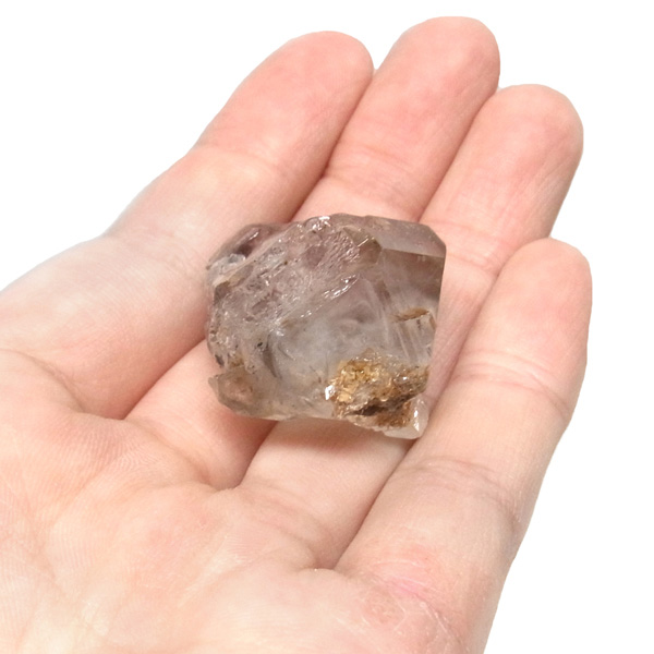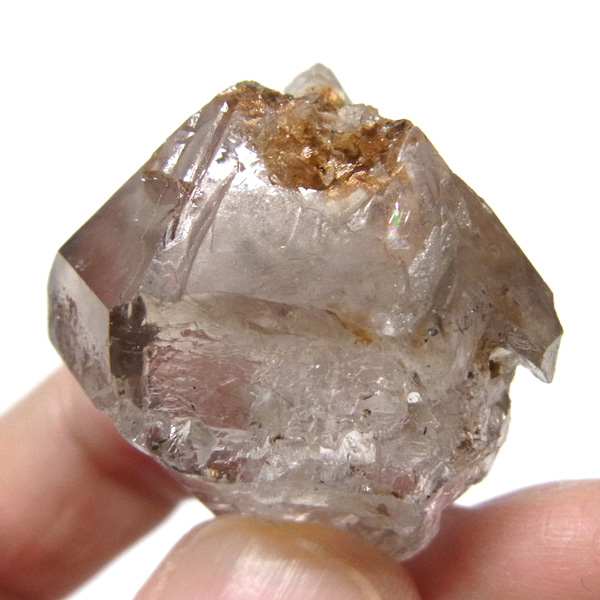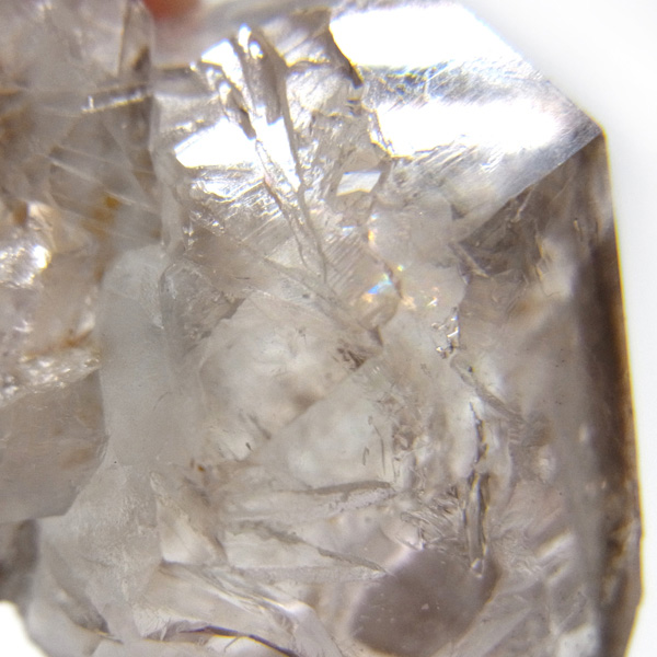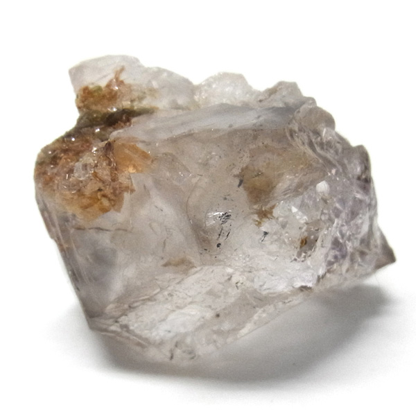 タンザニア産のモンドクォーツです。 エレスチャルという結晶になっており、何層かの成長をしています。水晶内部を覗いてみるとキラキラとしたレインボー、一部やや薄い黒茶のスモーキーがかっており、鏡のような結晶面など面白い部分が見られます。表面を見てみると黄色っぽいのは鉄分、緑の部分はクローライトでしょうか、はっきりとはわかりませんが共生しています。エレスチャルは両方がポイントの形をとる両錐で、柱面が短い結晶が多く見られます。複数の結晶が結合して形成されるため、表面がゴツゴツとし、通常の水晶ポイントのようなはっきりした形ではないのがわかります。表面がまるで鰐の鱗のように見えるものもエレスチャルの特徴です。