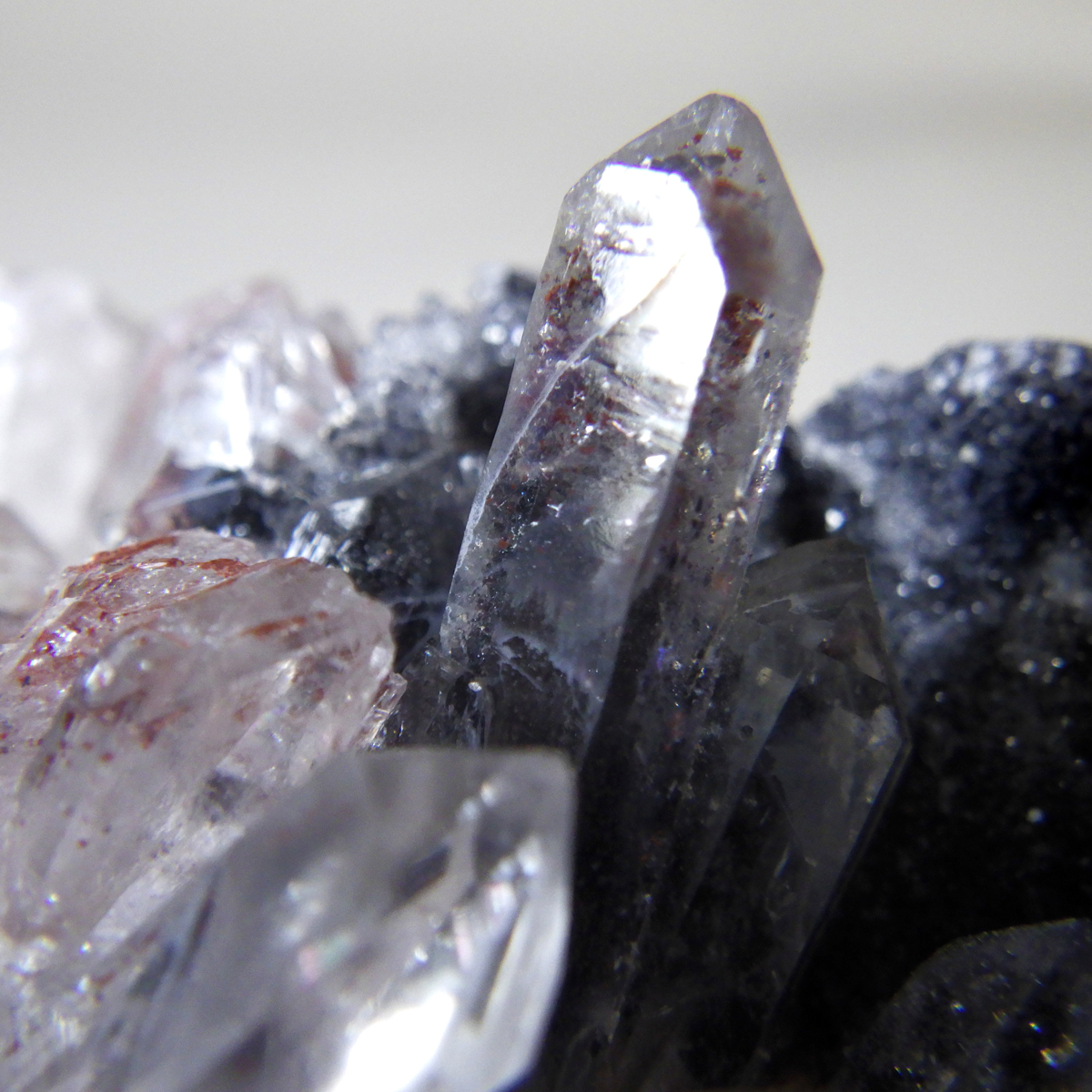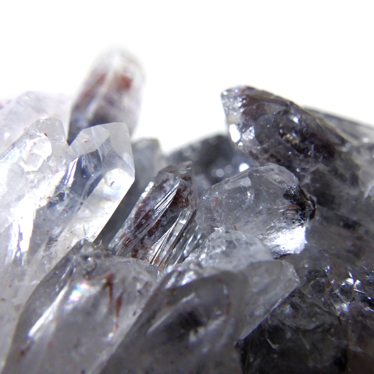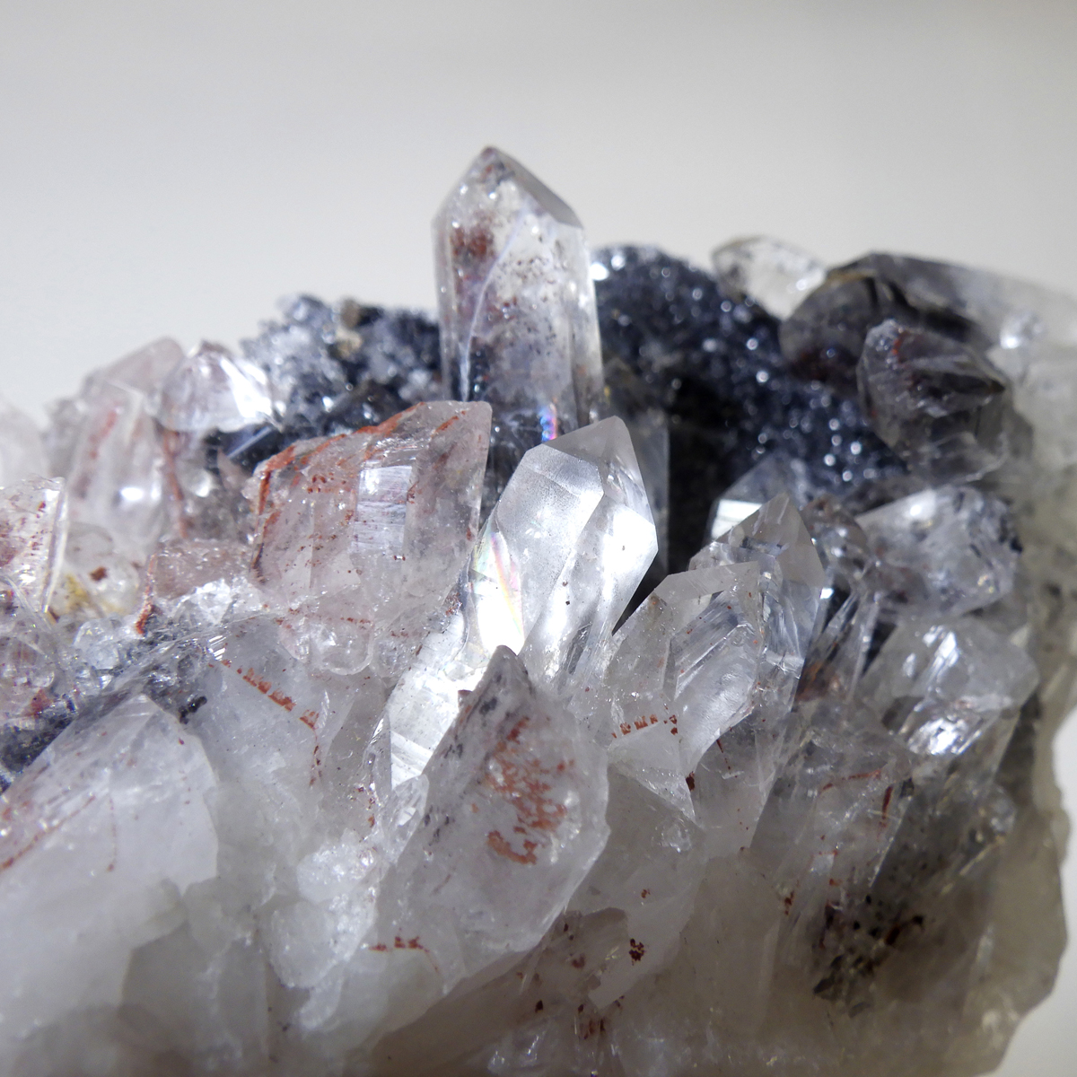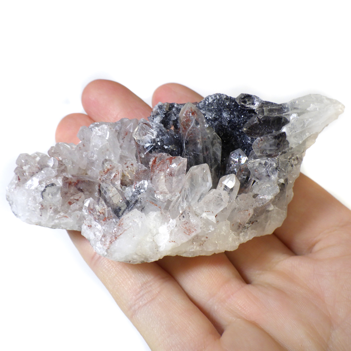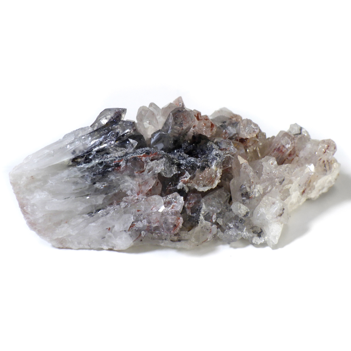 南インド産のサチャロカ水晶クラスターです。サチャロカ水晶は、南インドで崇拝されているサチャロカ修道院近隣の土地でわずかしか採掘されない天然の希少な水晶です。水晶の中に、ヘマタイトや鉄分などが多く含まれているため、黒や赤の内包物が見られます。内包物によってファントムが一部見られます。「サチャロカ」とは、サンスクリット語で「真実の場所」を意味し、古代から、エネルギーと癒しの力があると伝えられてます。