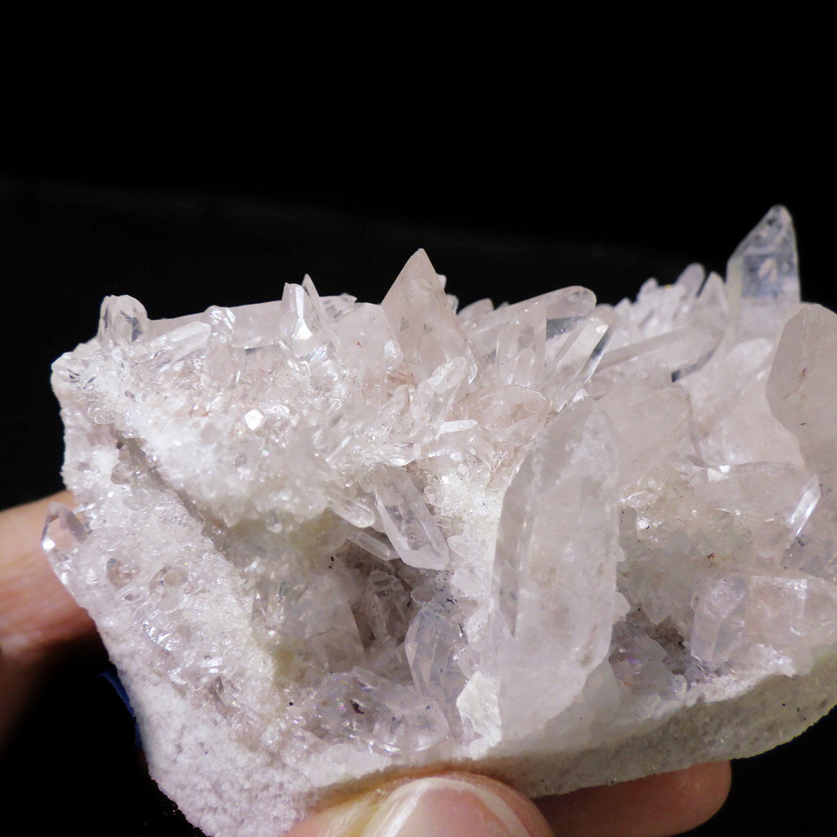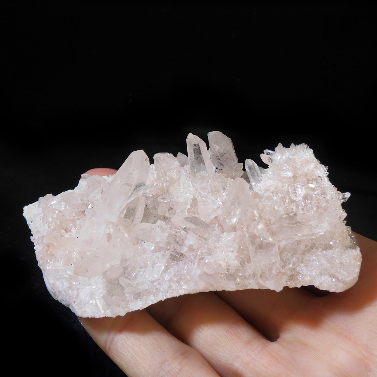 インド・ヒマラヤ山脈にあるパールバティー渓谷産の水晶クラスターです。この地で採掘される水晶には表面がピンク、又はグリーンをしたものがよく見られます。ピンク色の水晶といえばローズクォーツが有名ですが、それとは別で土壌に含まれる赤褐色をした酸化鉄により表面や母岩部がピンク色になっています。ほんのりと淡いピンク色や濃いピンク色、オレンジがかったピンク色などそれぞれ微妙に色合いも違います。グリーンはクローライトを内包したものになります。