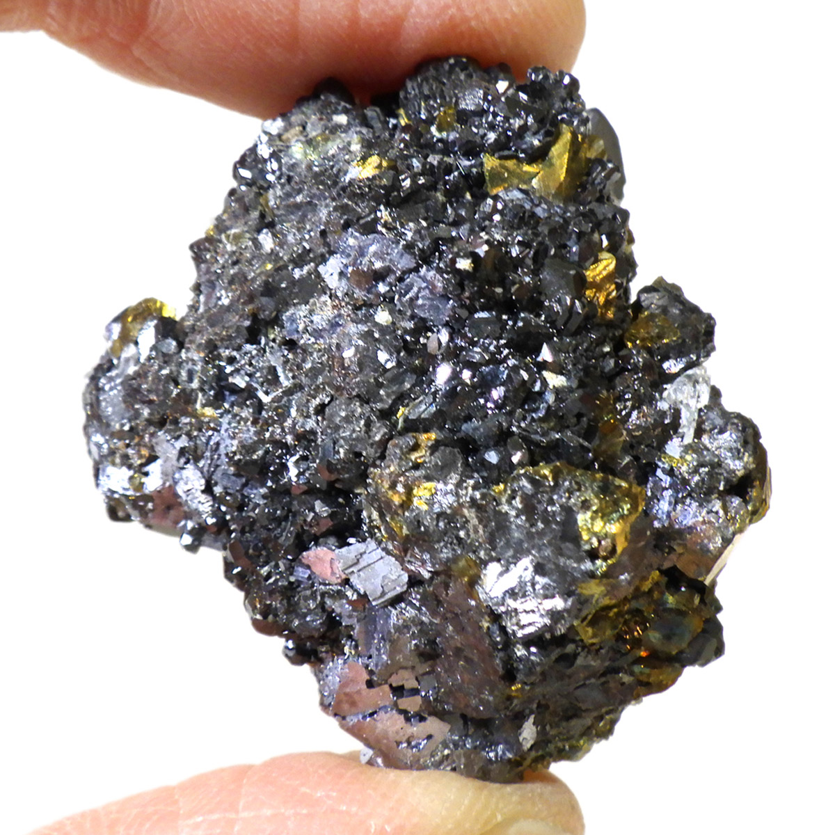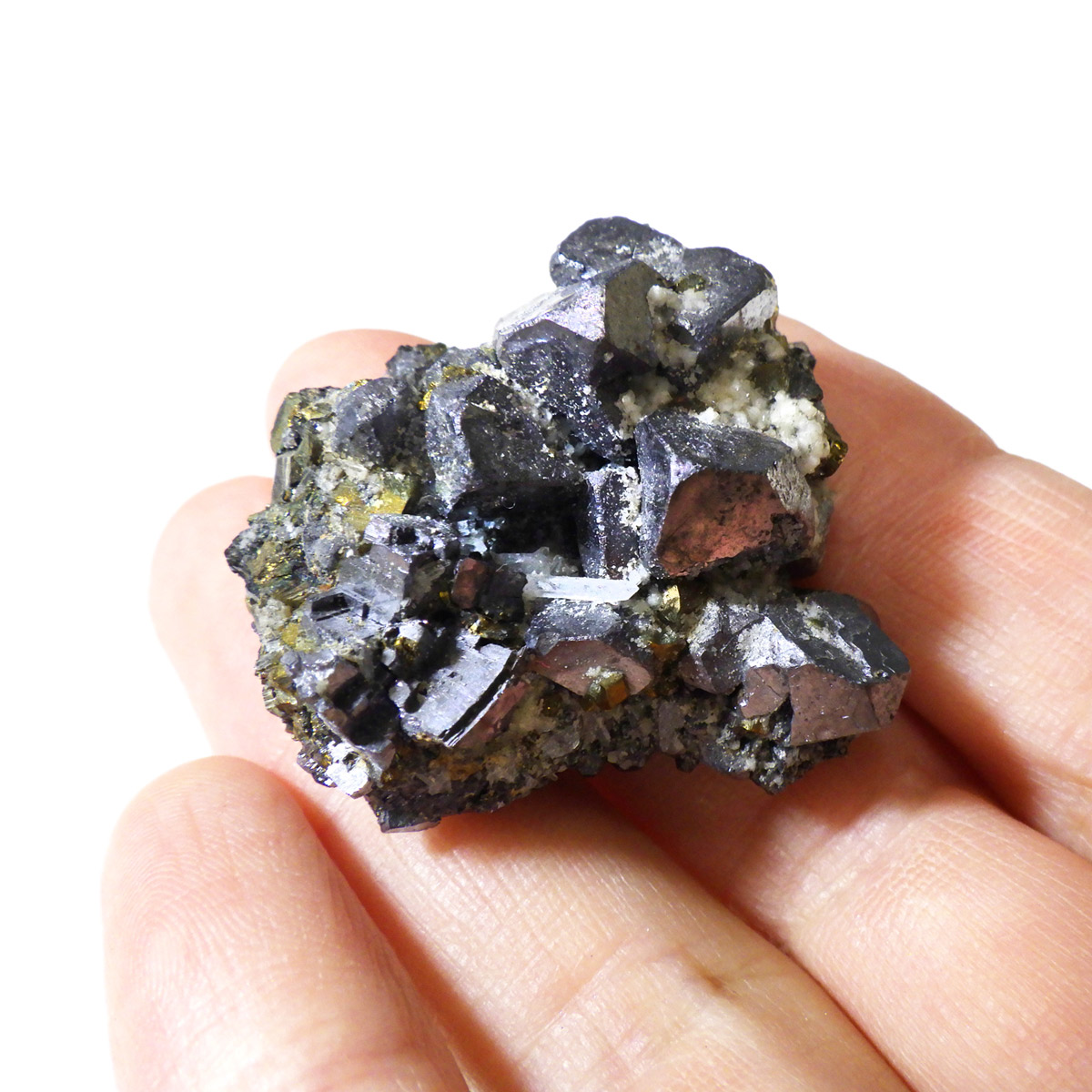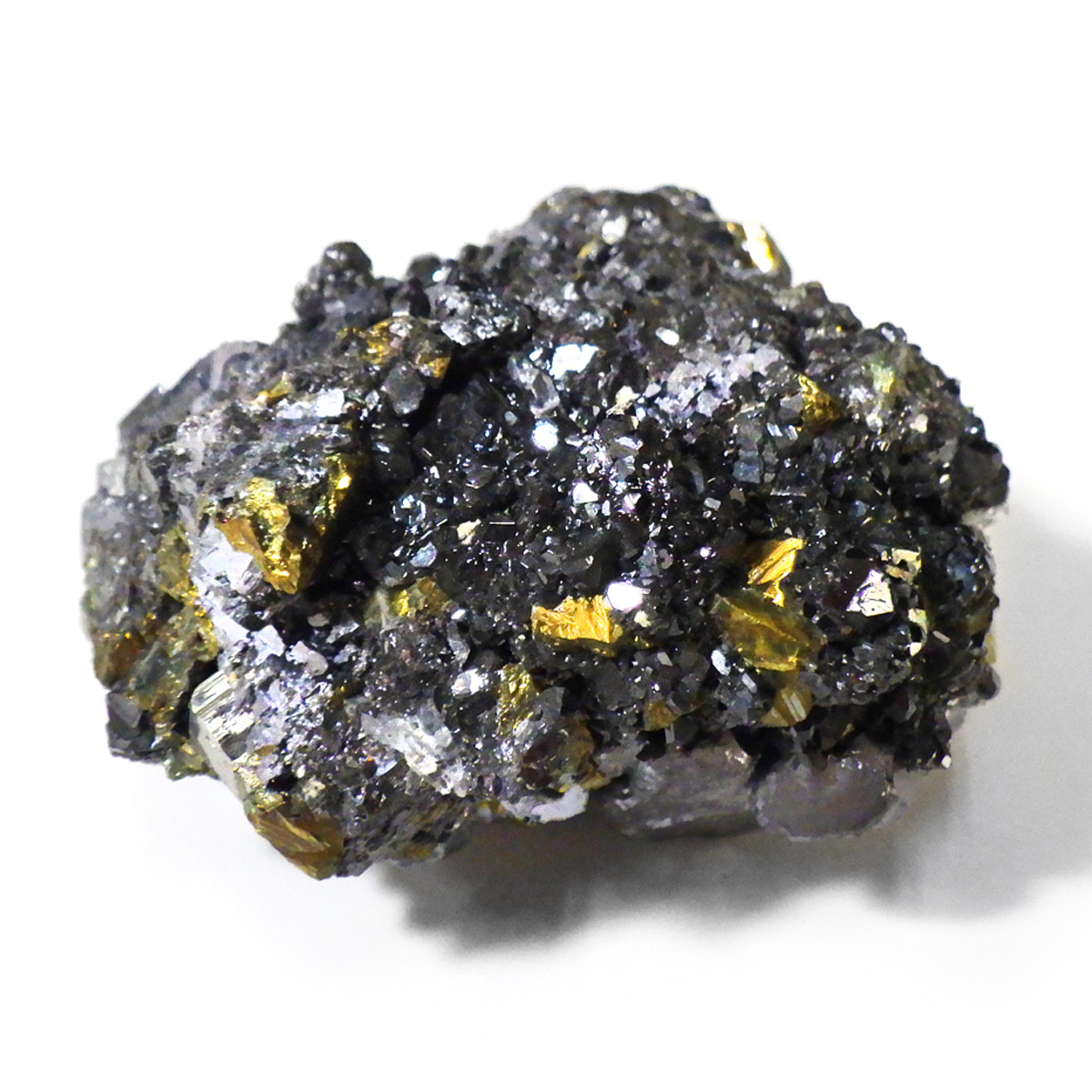 ブルガリアを代表する鉱物の産地、マダン産のガレーナ原石です。メタリックな趣が人気のガレーナと共生するクォーツと金色のキャルコパイライト。ガレーナの和名は「方鉛鉱」。その名の通り立方体状に結晶する石で、鉛の鉱石としては他にはないと言われています。工業用の鉛の原料となる石で、その中でもとびきり美しい物は、観賞用となります。鉛を含むため、ずっしりと重く、階段のような表面が特徴です。