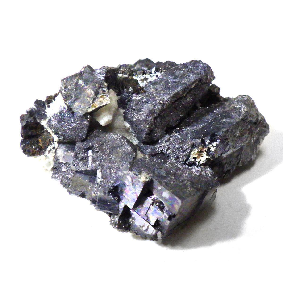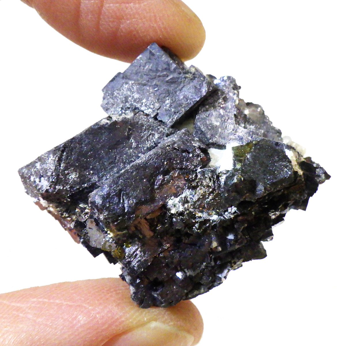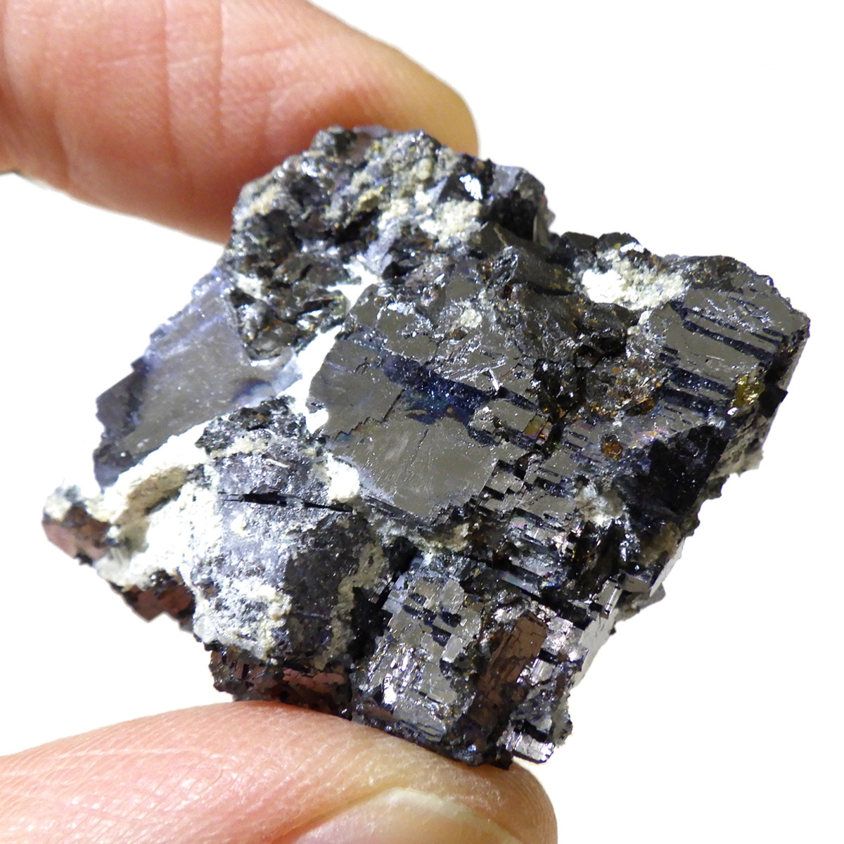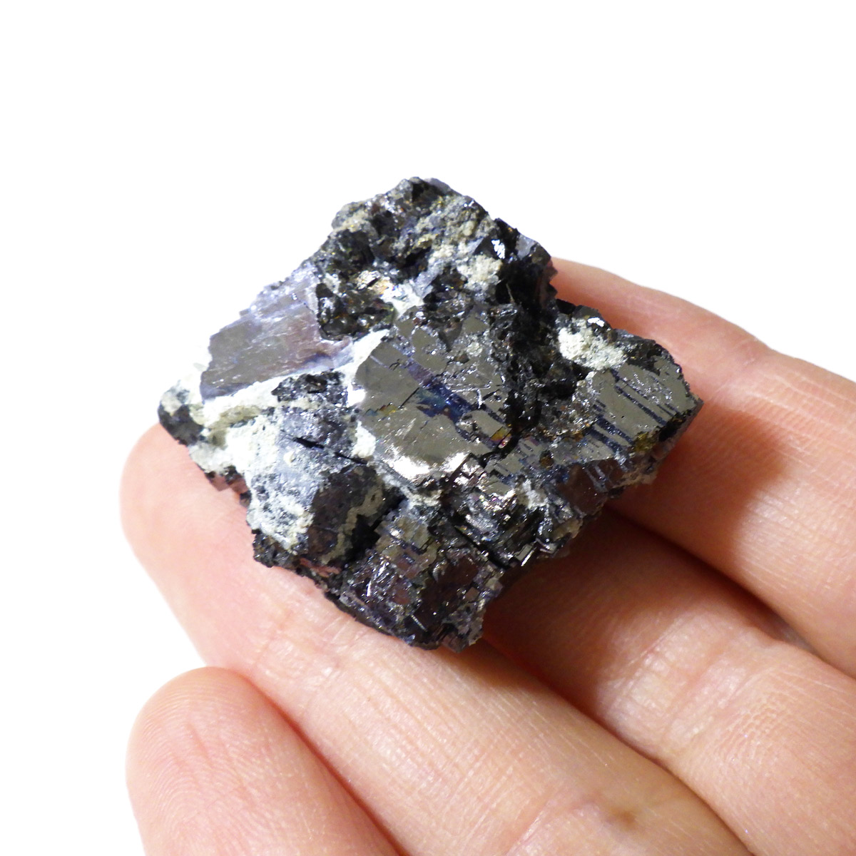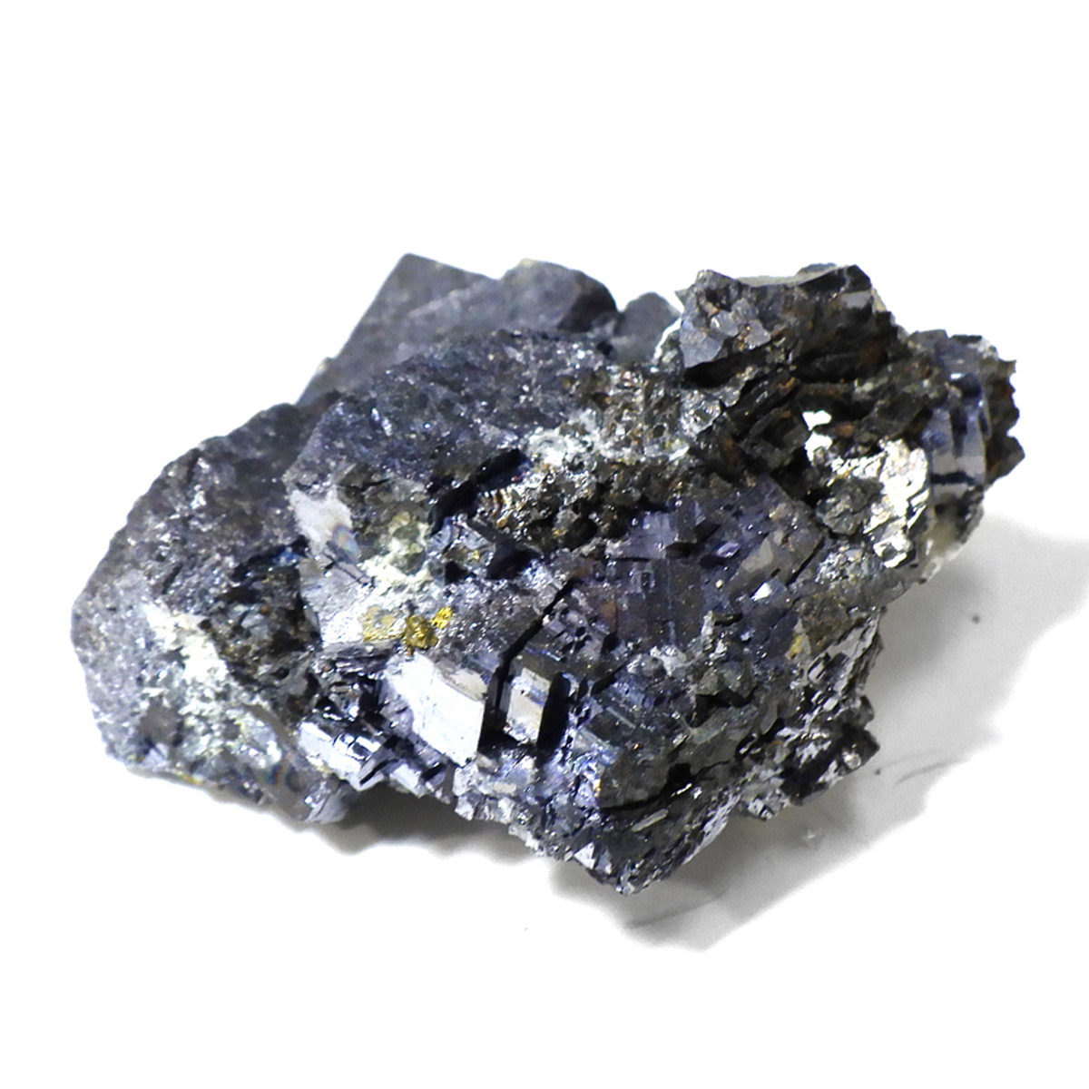 ブルガリアを代表する鉱物の産地、マダン産のガレーナ原石です。メタリックな趣が人気のガレーナと共生するクォーツと金色のキャルコパイライト。ガレーナの和名は「方鉛鉱」。その名の通り立方体状に結晶する石で、鉛の鉱石としては他にはないと言われています。工業用の鉛の原料となる石で、その中でもとびきり美しい物は、観賞用となります。鉛を含むため、ずっしりと重く、階段のような表面が特徴です。