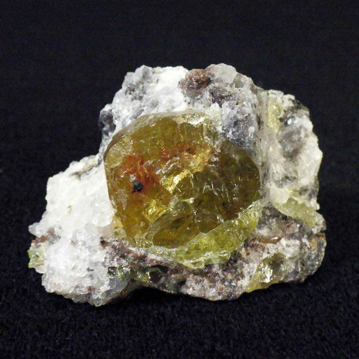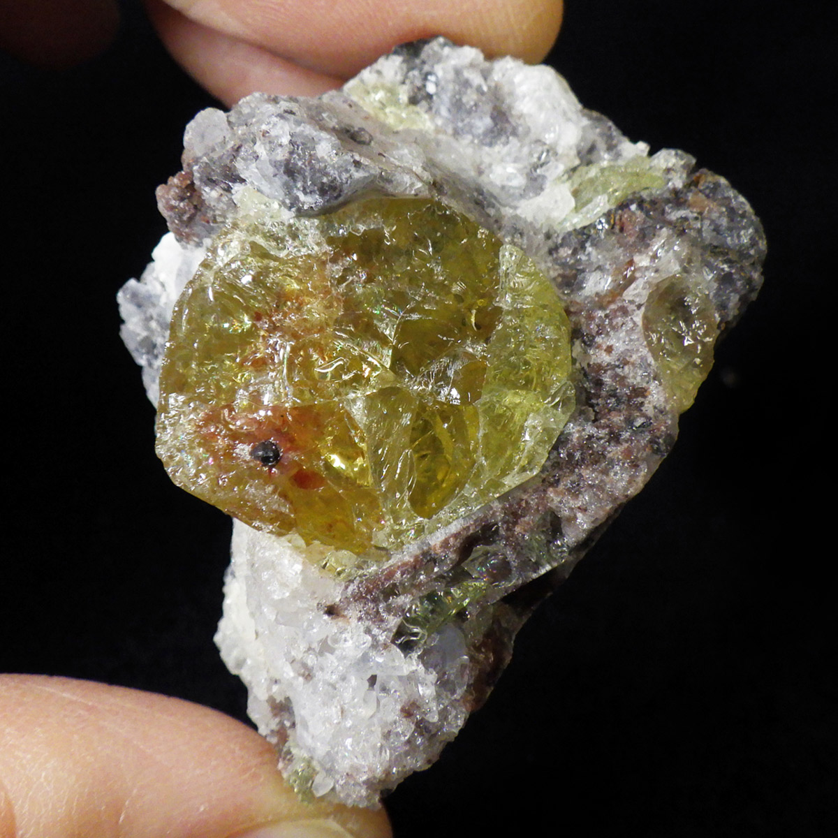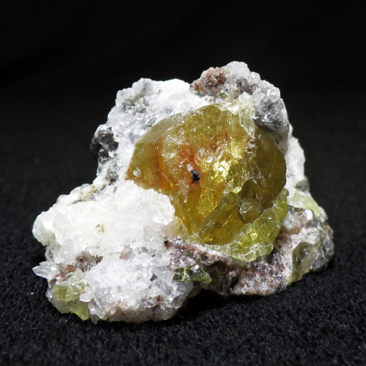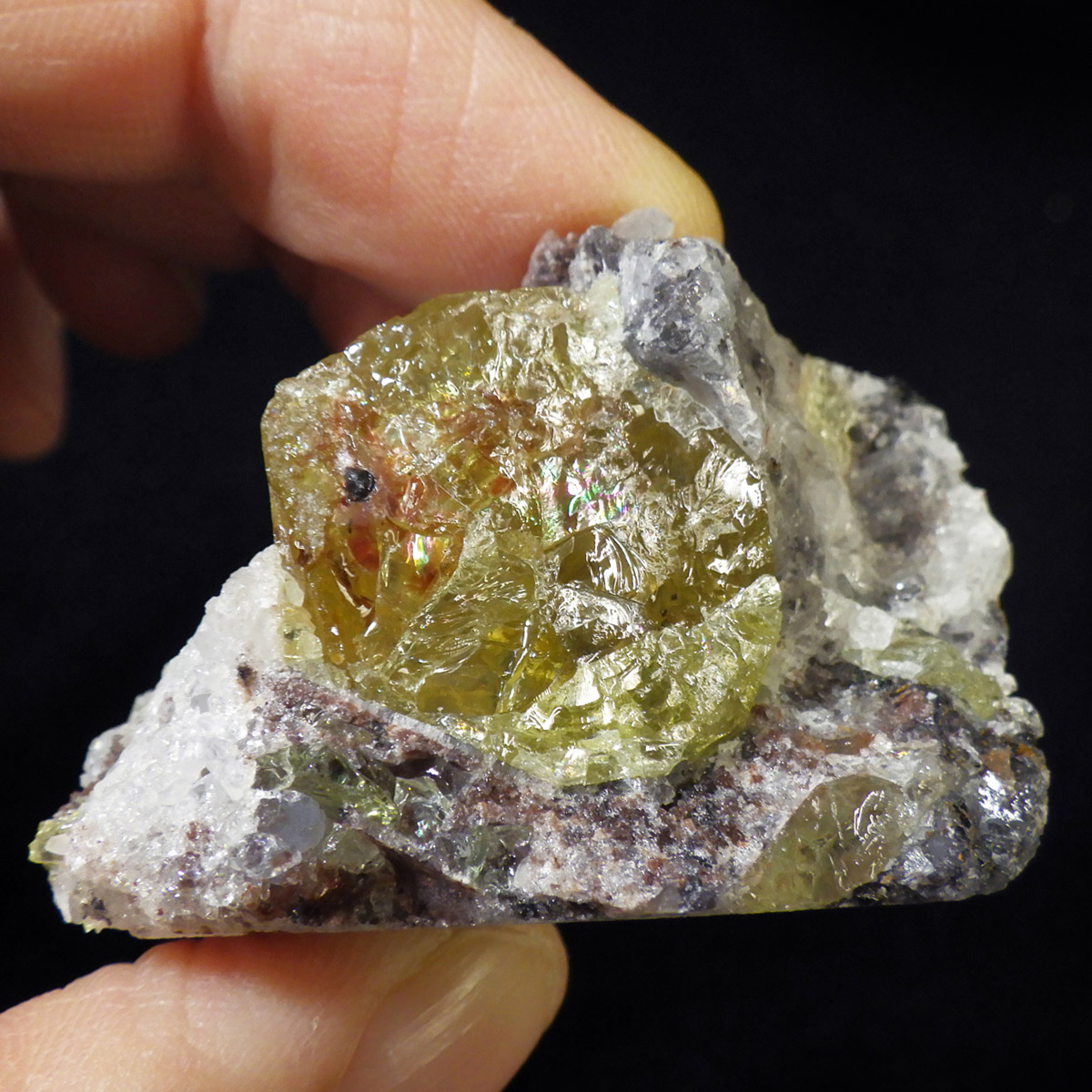 メキシコ産イエローアパタイトの母岩付き結晶原石です。 非常に透明度の高い、イエローグリーンの六角柱や六角板がキラキラと、大変美しく魅了されます。 角度によってはキラりとレインボーが輝き、とても高品質で貴重な一点です。 透明度の高い綺麗な結晶を持つため、宝石としても使用されます。 ミネラルの中でも、最もマイナスイオンを発することから、「究極の癒し系パワーストーン」と言われています。