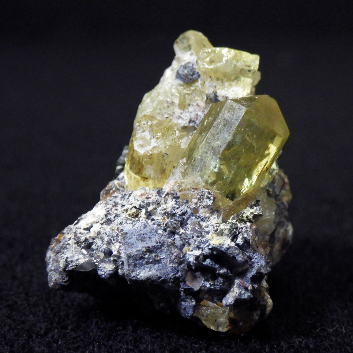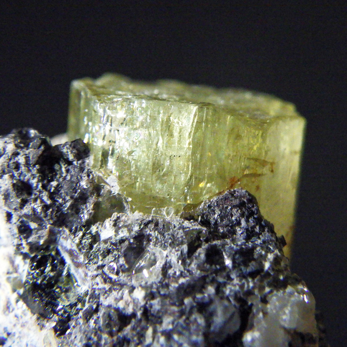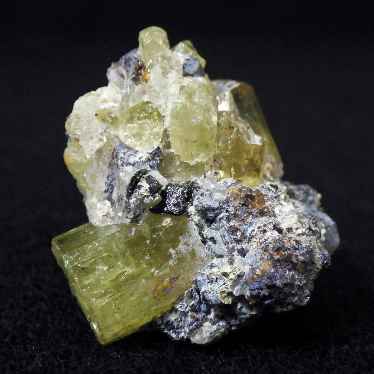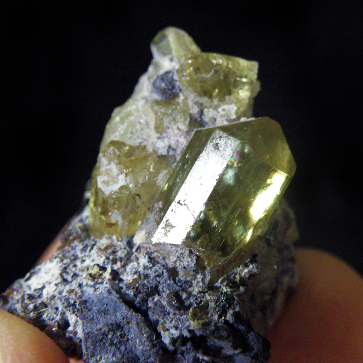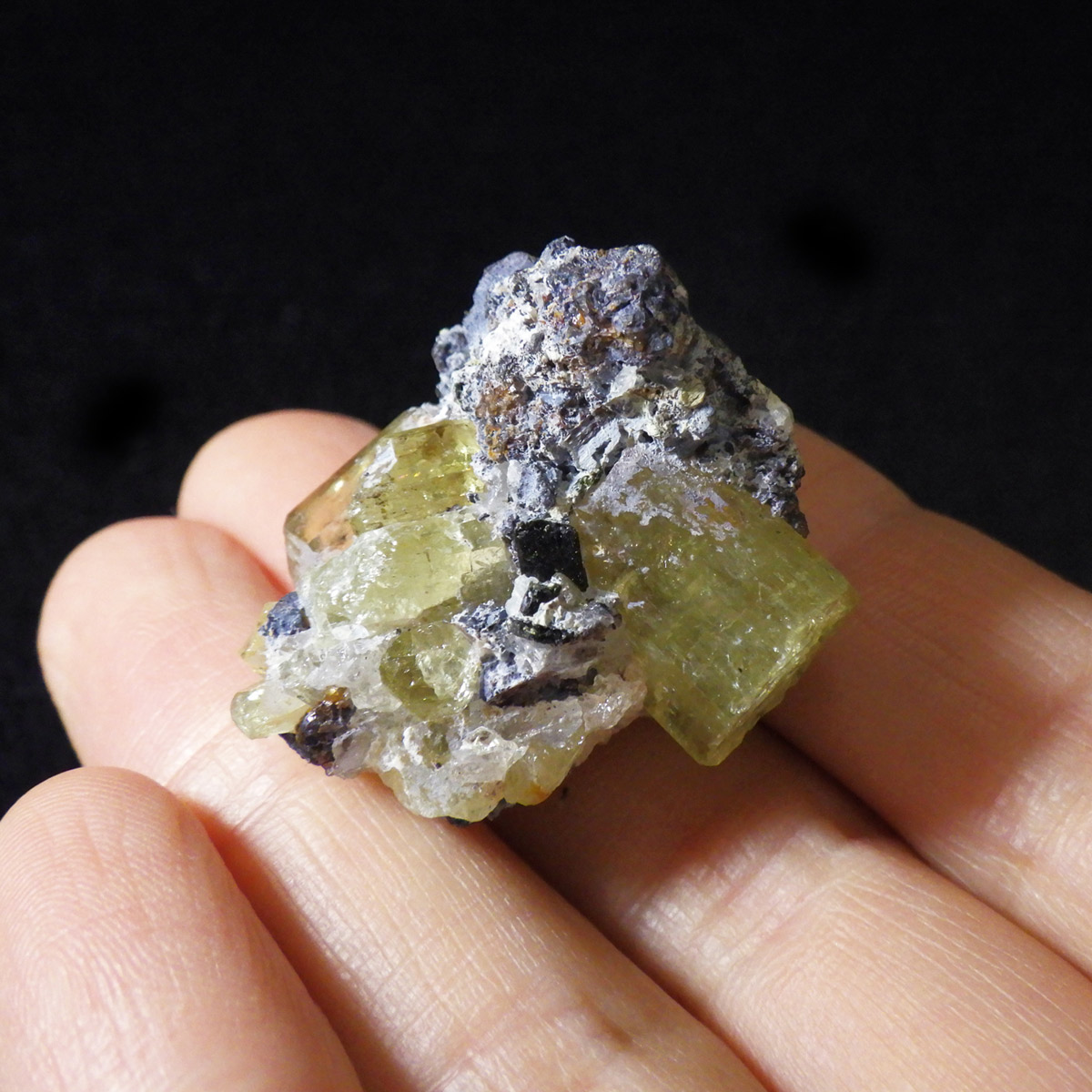 メキシコ産イエローアパタイトの母岩付き結晶原石です。 非常に透明度の高い、イエローグリーンの六角柱や六角板がキラキラと、大変美しく魅了されます。 角度によってはキラりとレインボーが輝き、とても高品質で貴重な一点です。 透明度の高い綺麗な結晶を持つため、宝石としても使用されます。 ミネラルの中でも、最もマイナスイオンを発することから、「究極の癒し系パワーストーン」と言われています。