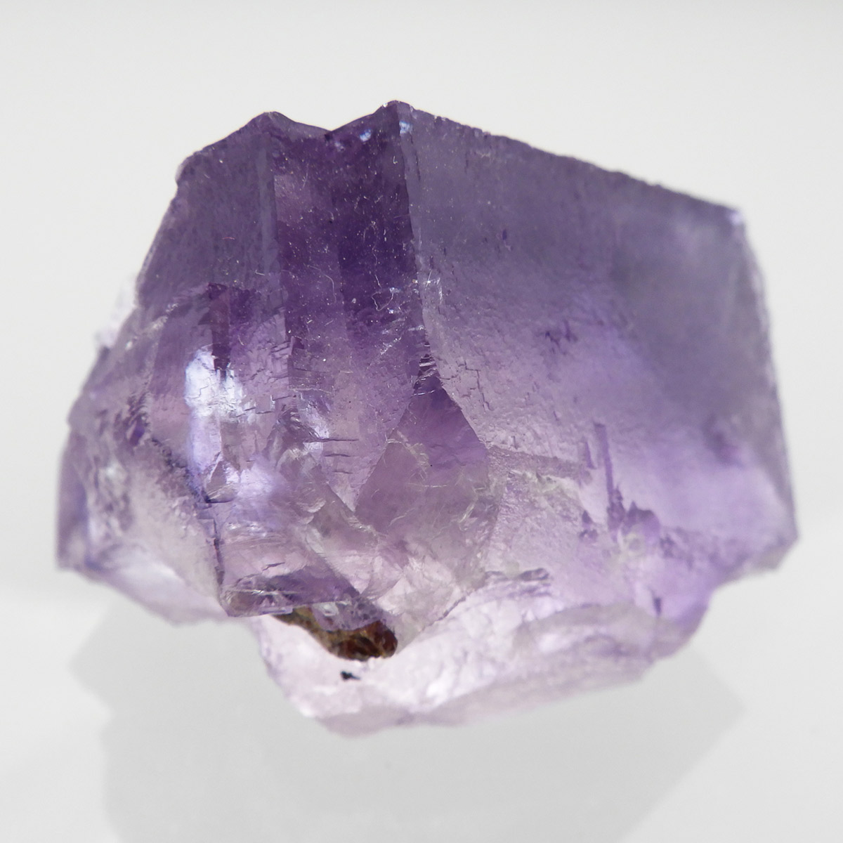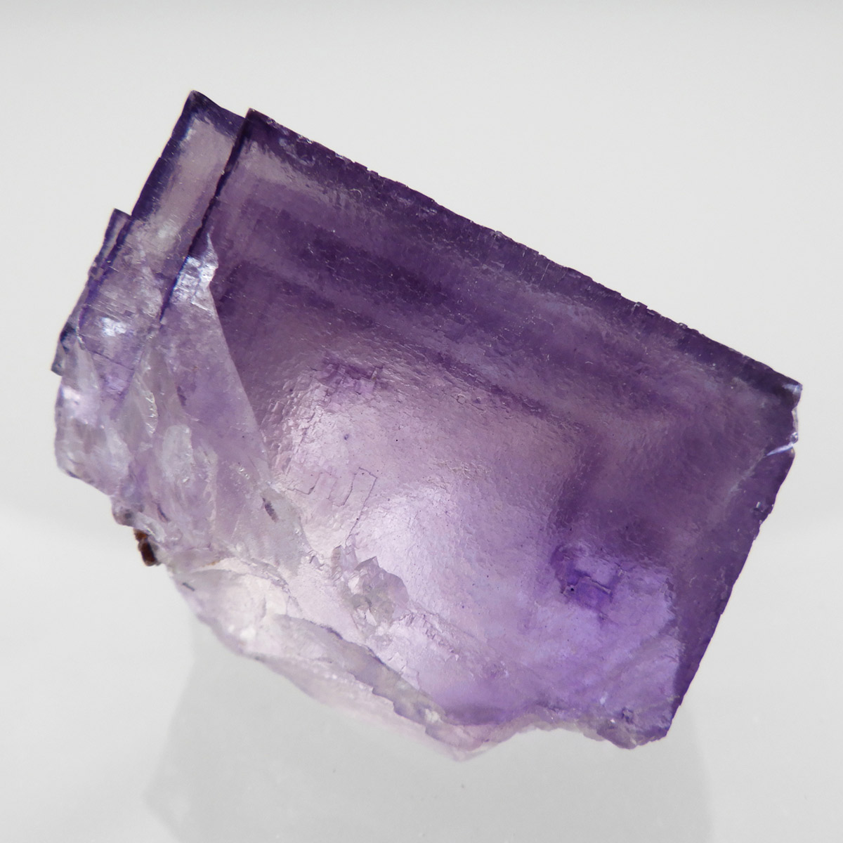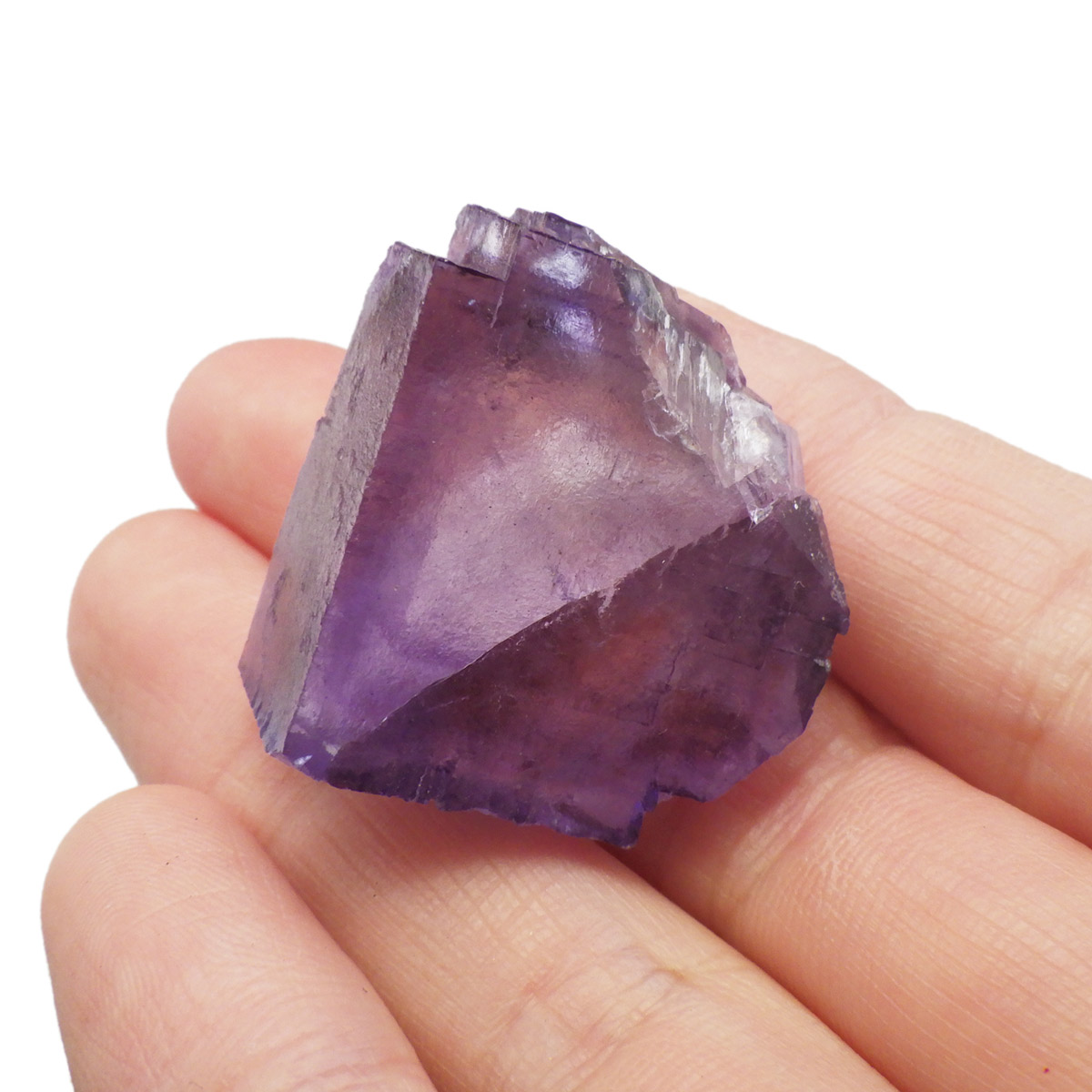 アメリカ・テネシー州、エルムウッド鉱山産のフローライト(蛍石)原石です。 大きな結晶の表面に幾何学模様が刻まれており、レインボーも確認できます。 先端に行く程、パープルが濃くなっていくのが特徴的。光にかざすと半透明で幻想的で美しいです。