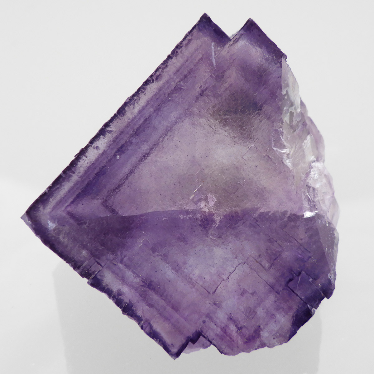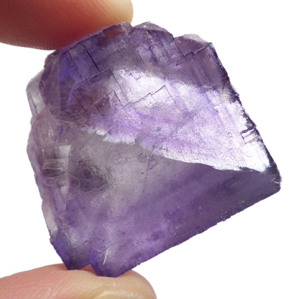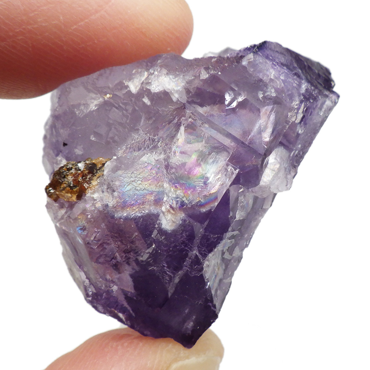 アメリカ・テネシー州、エルムウッド鉱山産のフローライト(蛍石)原石です。 大きな結晶の表面に幾何学模様が刻まれており、レインボーも確認できます。 先端に行く程、パープルが濃くなっていくのが特徴的。光にかざすと半透明で幻想的で美しいです。