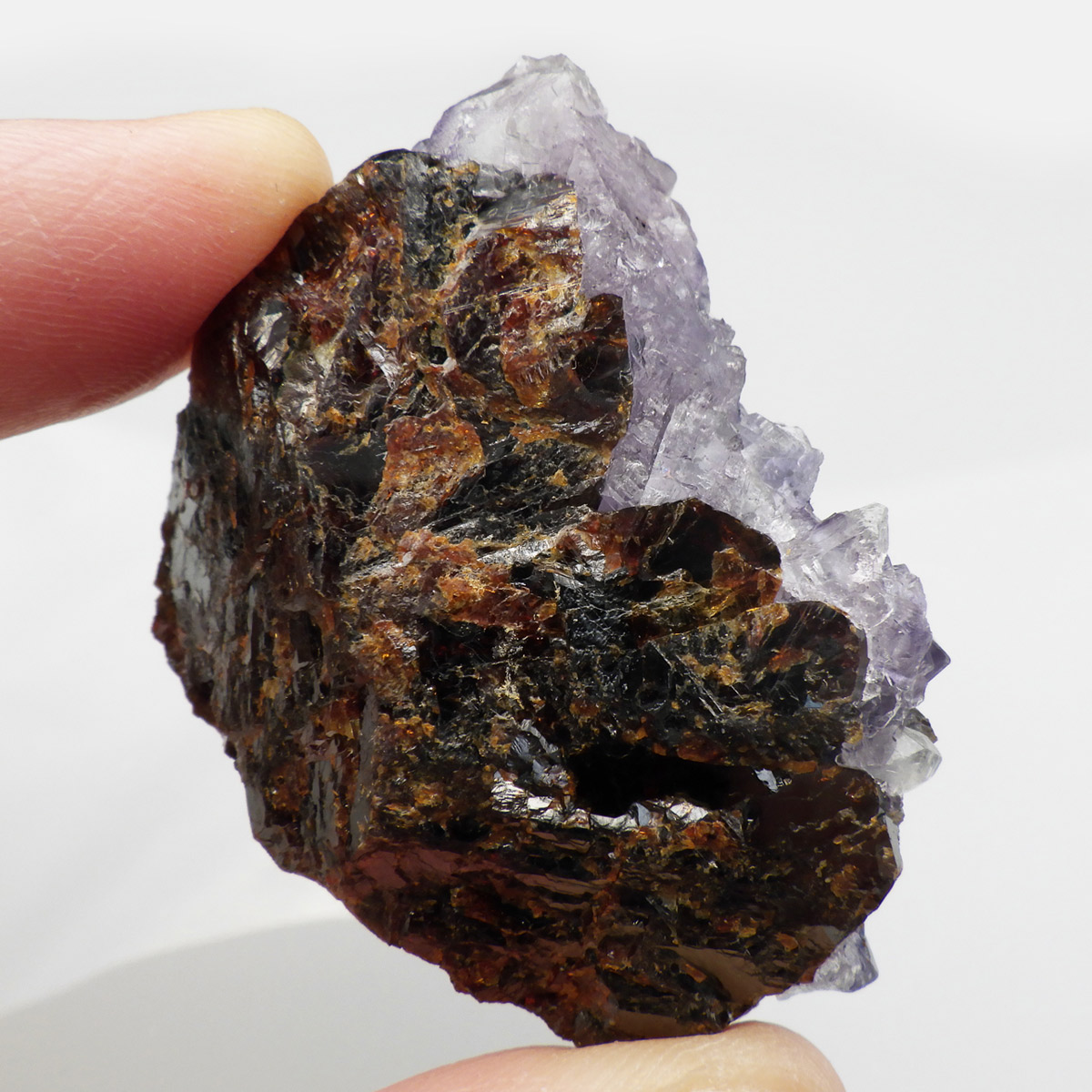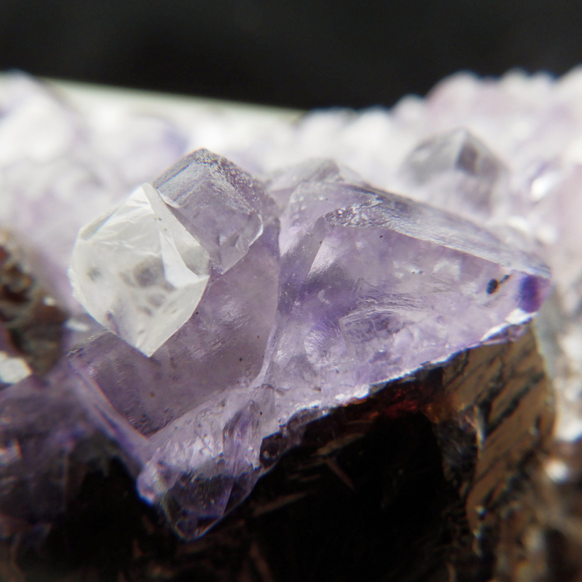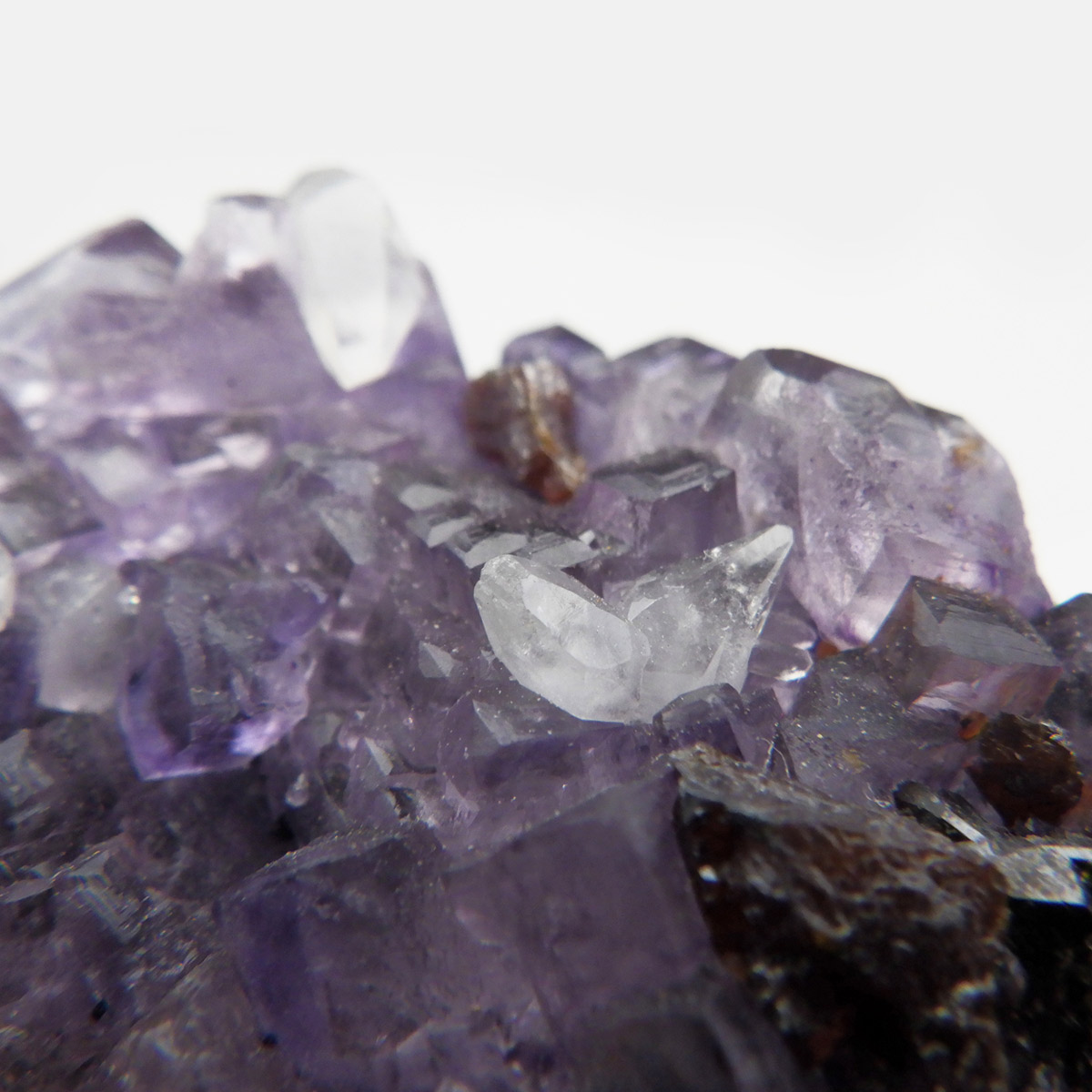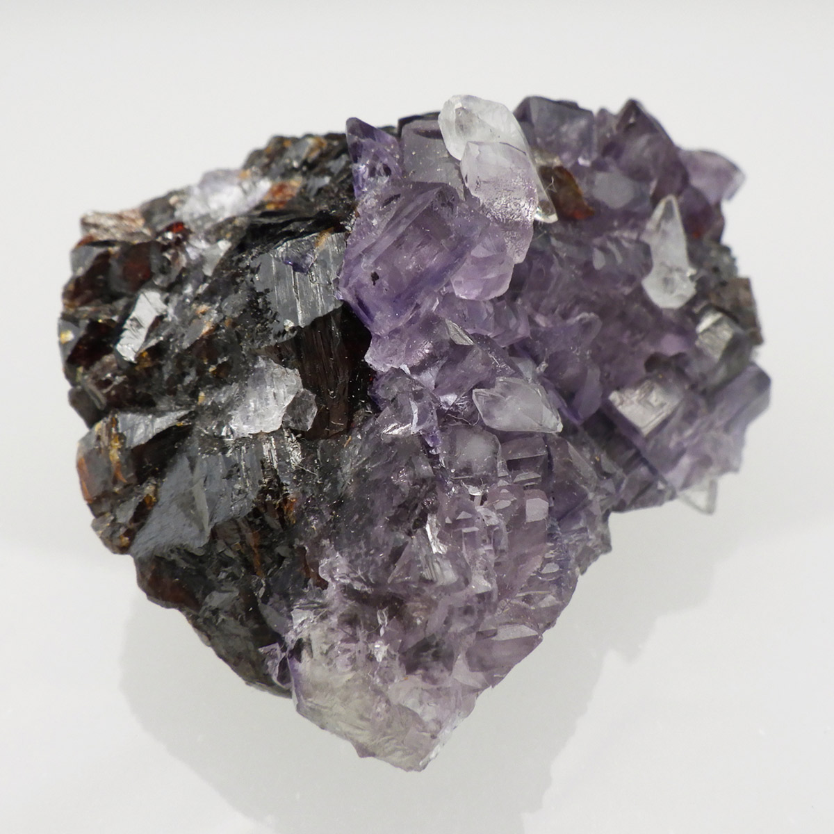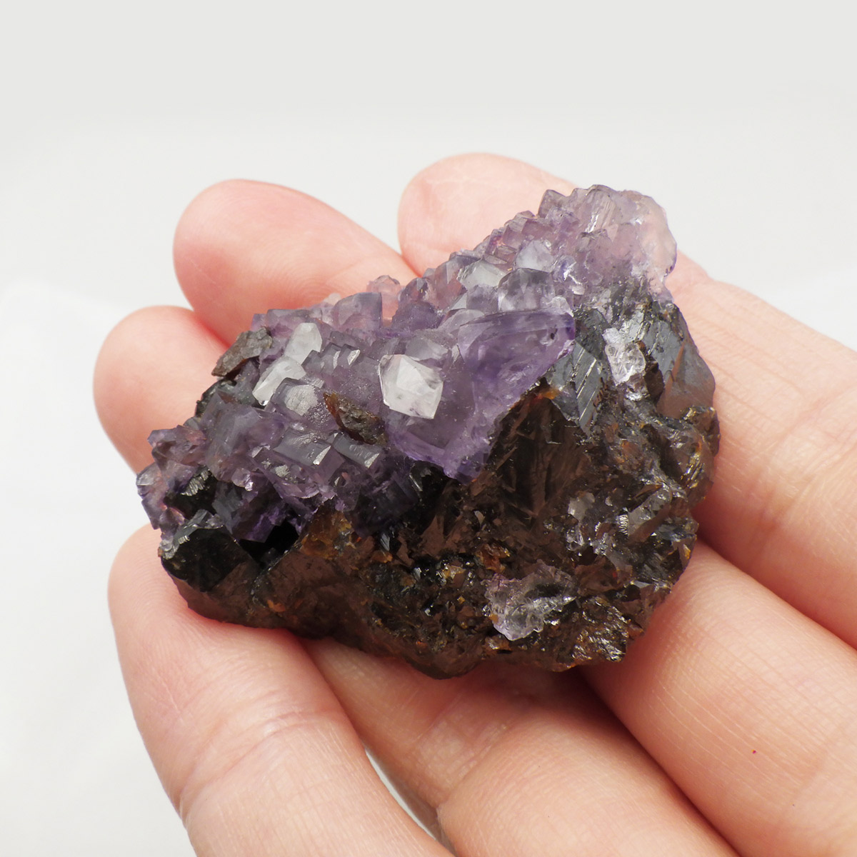 アメリカ・テネシー州、エルムウッド鉱山産のフローライト(蛍石)原石です。 裏面はスファレライトの美しさを見ることができます。 水晶と共生しているフローライトが可愛らしいです。