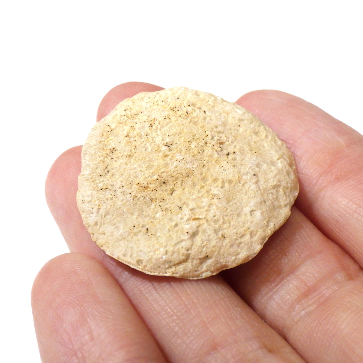 和名は貨幣石(かへいせき)といい、学名=Nummlites(ヌムリテス)といいます。