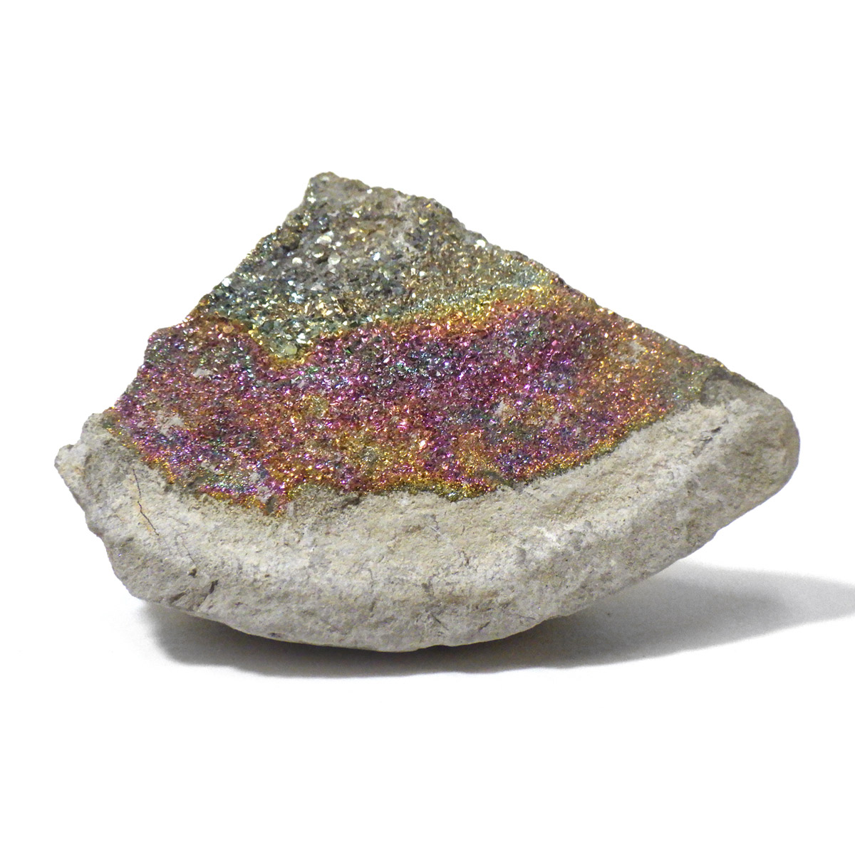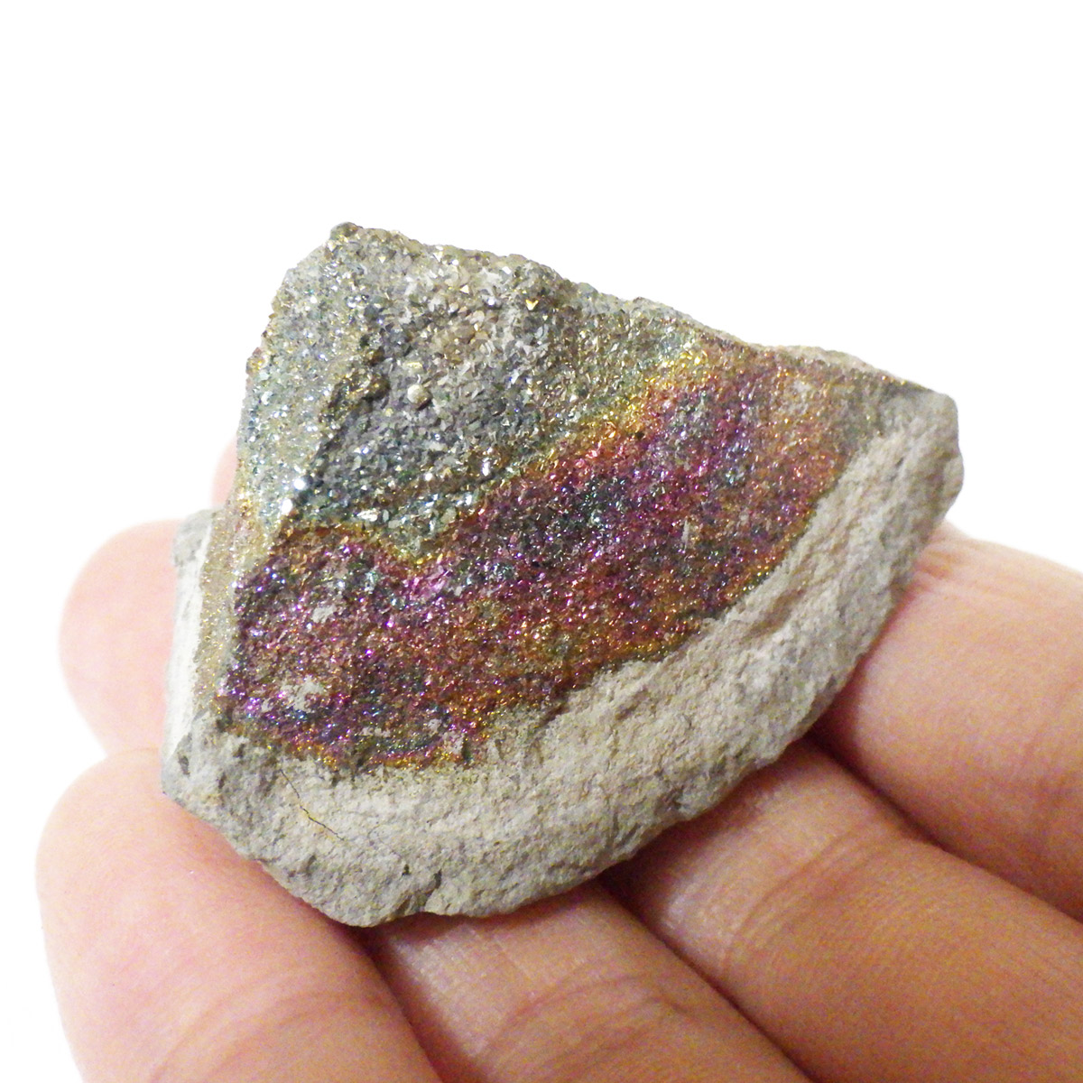 ロシア産チャルコパイライト原石です。卵形の石の塊(ノジュール)を割ると、中から虹色のチャルコパイライトが姿を現します。そのことから現地ではパイライトエッグと呼ばれています。ノジュールを割っても必ずチャルコパイライトが結晶しているわけではないのでキラキラとした綺麗な標本は貴重であります。チャルコパイライトの鮮やかな色で出回っているのもは、人工的に酸化処理を施しているものもありますが、こちらはナチュラルなものになります。時間が経過すると石の断面が酸化して黒ずんだり、鮮やかな虹色に変化する事があります。