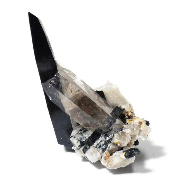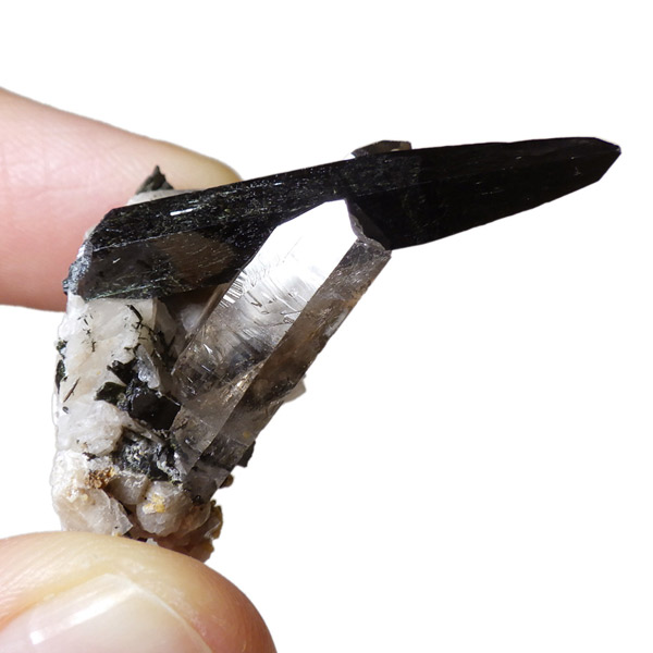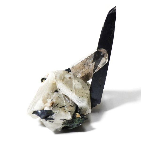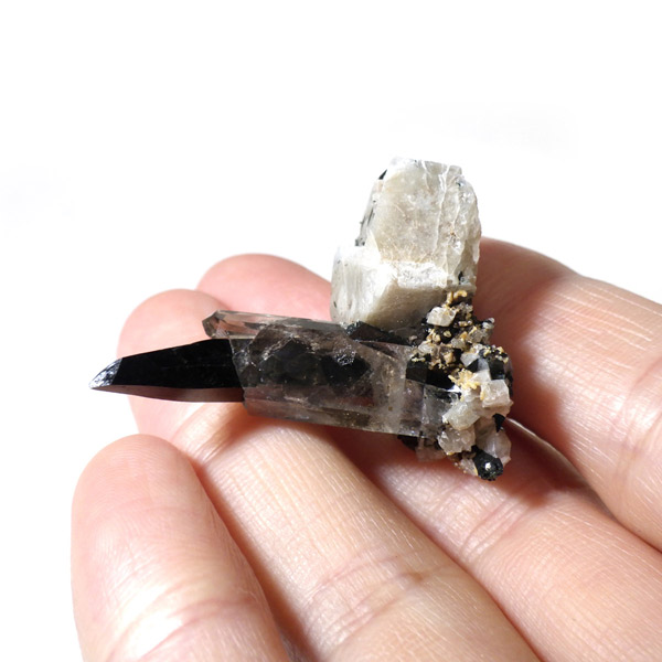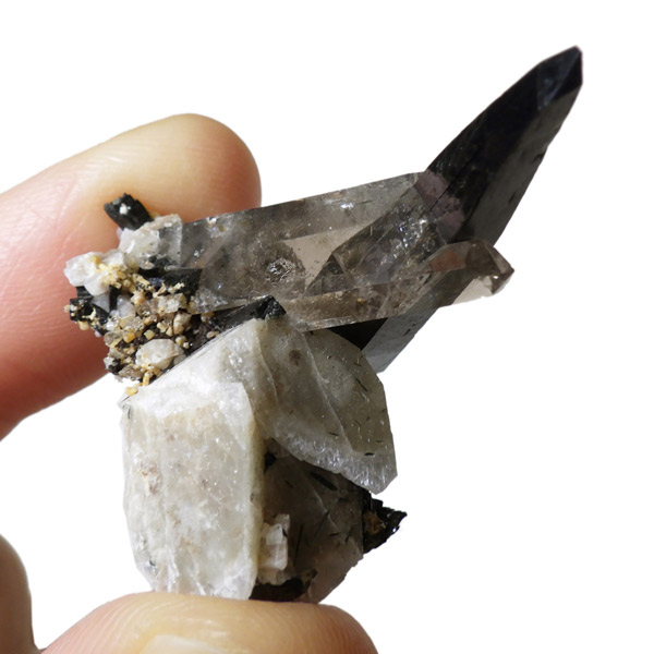 アフリカのマラウイ共和国産のエジリンwithスモーキークォーツandフェルドスパー原石です。エジリンの和名は錐輝石。柱状及び針状の晶癖で表面は光沢があります。濃緑色や黒の色調が確認できます。スモーキークォーツがエジリンとぶつかって成長し、抱き込まれている面白い結晶です。不透明な白い部分はフェルドスパー(長石)です。小さいながらに大変綺麗な結晶です。