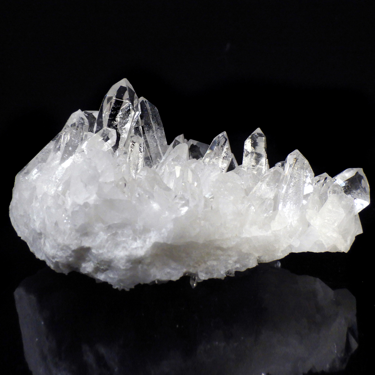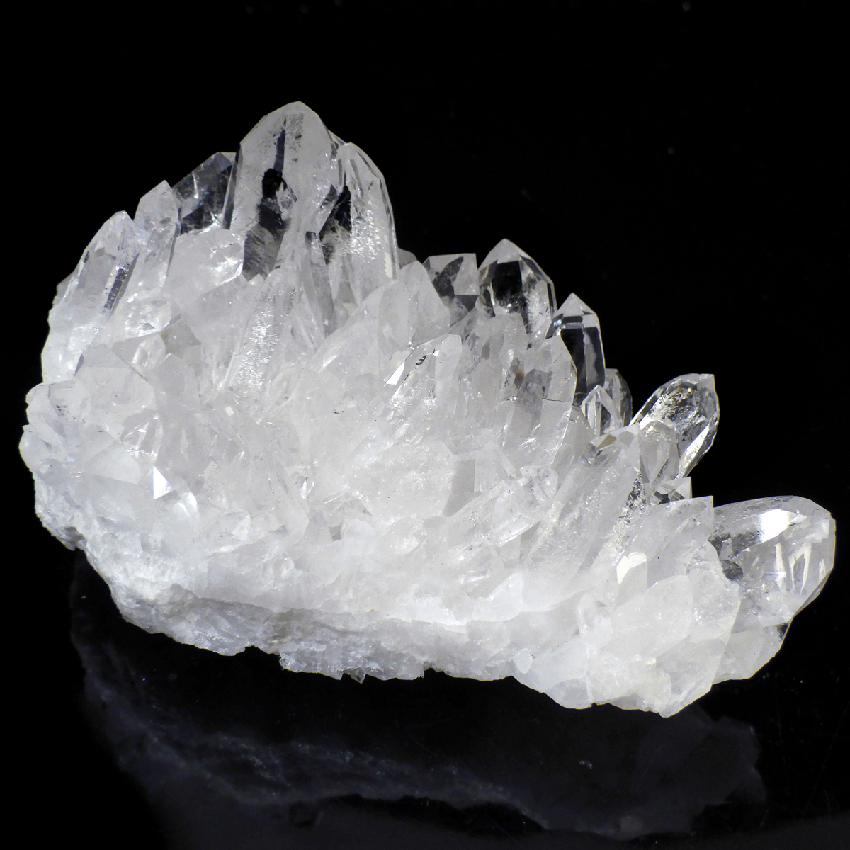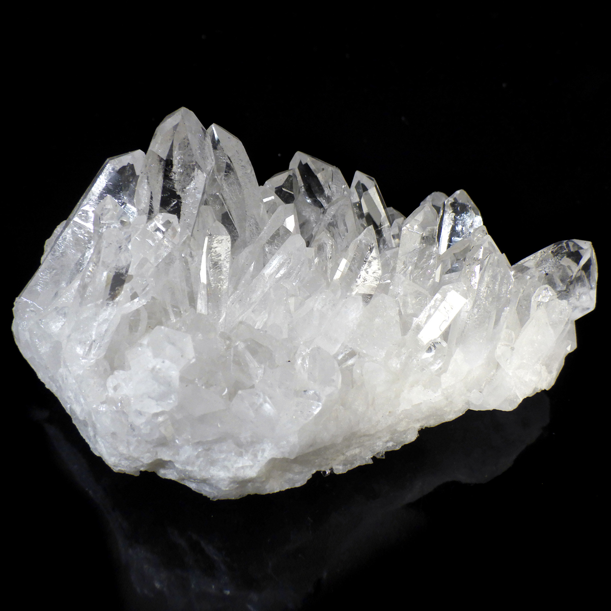 ブラジル トマスゴンサガ産 の水晶クラスターです。トマスゴンサガ産の水晶の特徴は、照りと艶。 光沢が強いため、驚くほどキラキラとしています。 また、水晶柱が放射線状に伸びて立体的な構造を作っているものが多く、「これぞ、水晶クラスター」という形状をしています。 非常に透明度の高い大小様々な結晶が複雑に絡み合い、見る角度によって様々な表情を見せる大変美しいクラスターです。